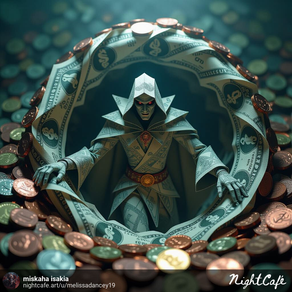 A dollar bill vampire formed from origami paper emerges from a coin vortex. Features intricate patterns, dramatic lighting, and cinematic film aesthetics.