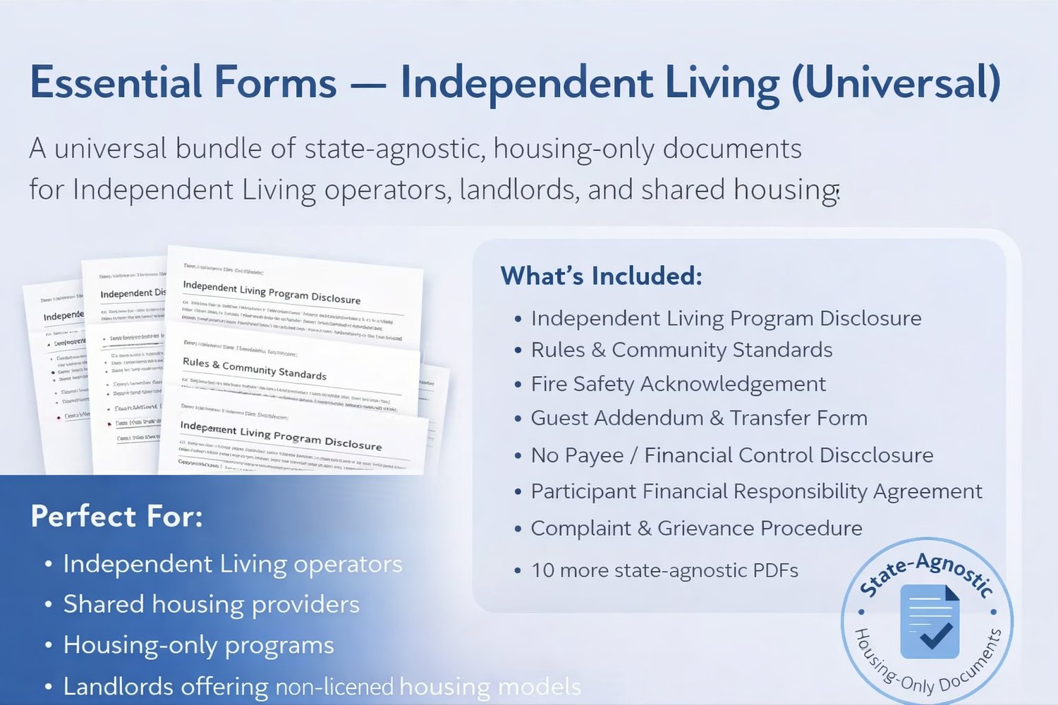 This Essential Forms bundle provides a clean, universal, housing-only document set designed for Independent Living operators, landlords, and program owners.