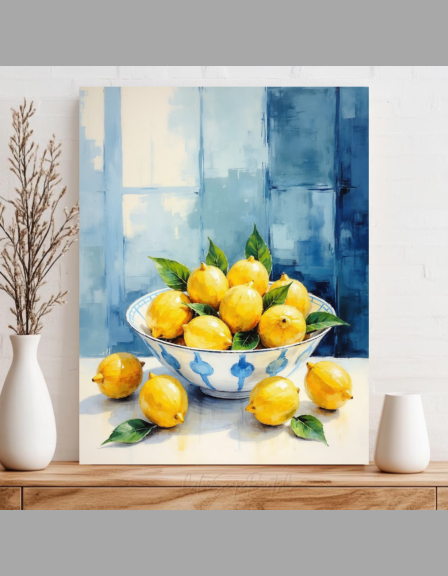 Zesty Lemons in Blue Bowl - Vibrant Still Life Kitchen Art Print