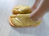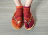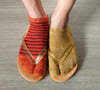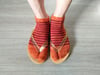 Tabi are Japanese traditional socks, generally in plain white, with a separation for the big toe to wear traditional thonged footwear. To give them a fun twist, I have used vivid colors and added stripes.