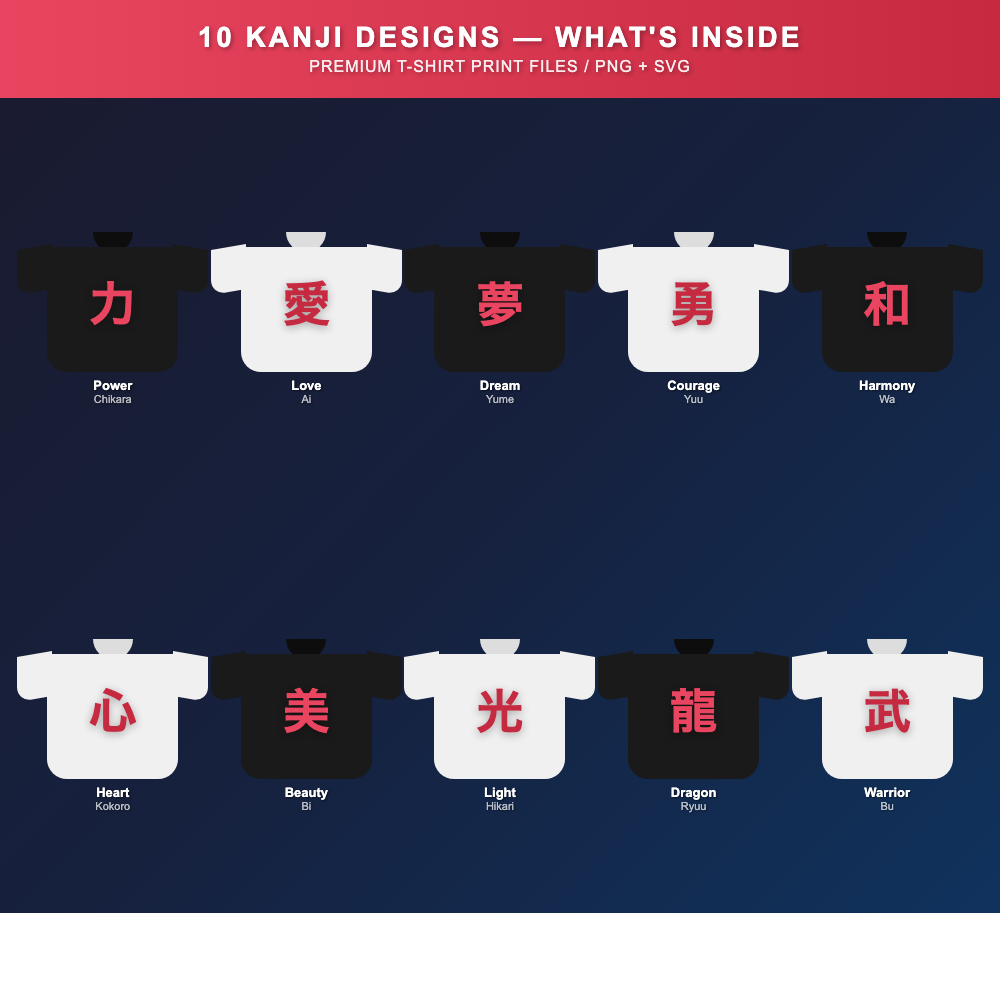 Japanese Kanji T-Shirt Designs 10-Pack | SVG for Print on Demand | Love Strength Peace Warrior