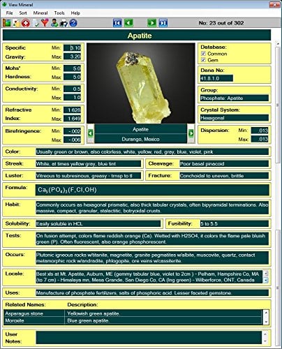 - Powerful Search Tools:Browser View: Sort minerals by Name or Dana number.