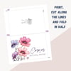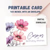 Printable Happy Birthday card featuring the Cosmos flower, perfect for flower lovers or anyone born in October, as it is the birth flower of the month. This digital download birth month card with cosmos flowers is a thoughtful way to show affection to a friend or family member and makes a great last-minute gift.