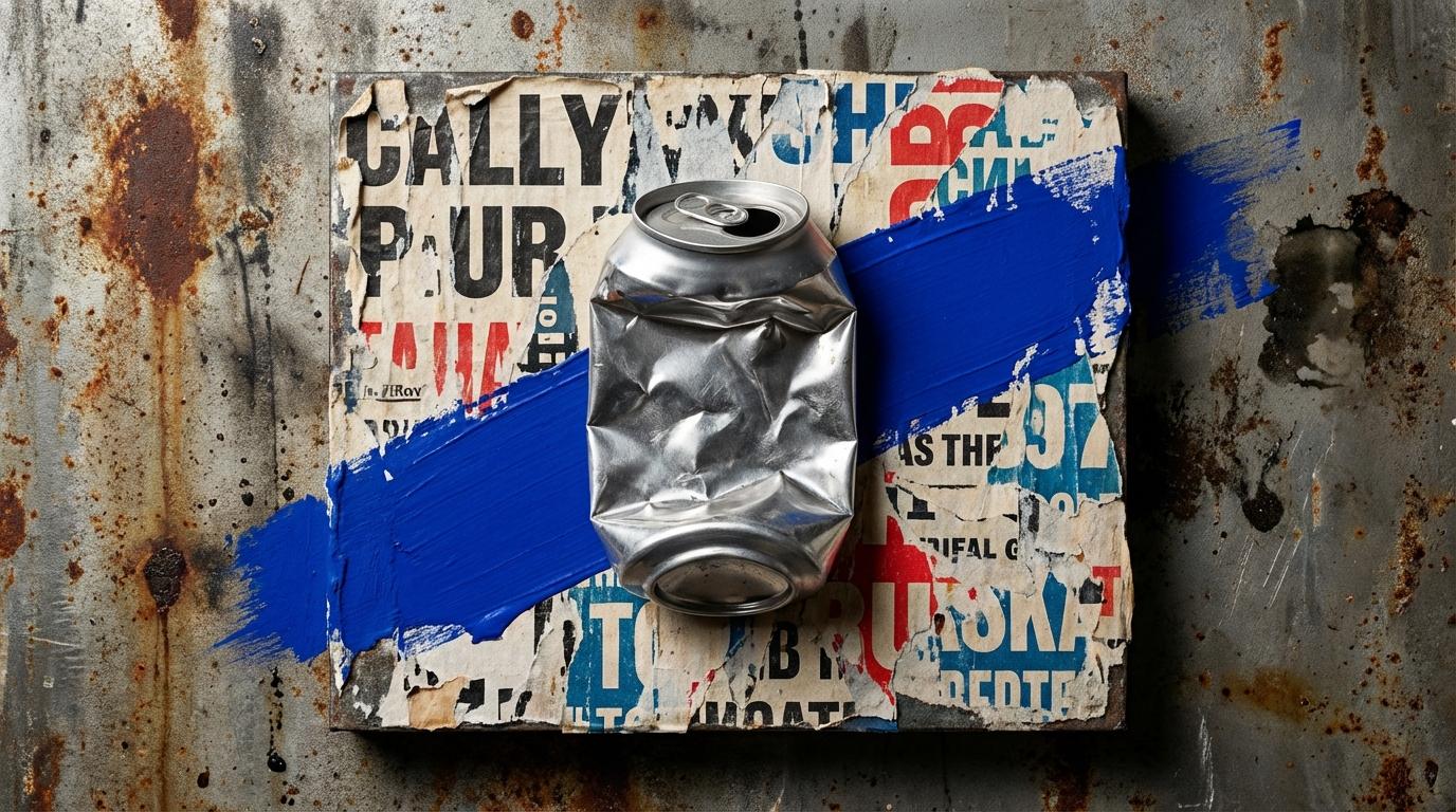 This visceral mixed-media assemblage reinterprets the ghostly, multi-layered aesthetic of the original image through a lens of urban decay and physical texture. A central crushed aluminum can serves as a focal point, mounted on a square panel composed of distressed vintage posters and torn typography.
