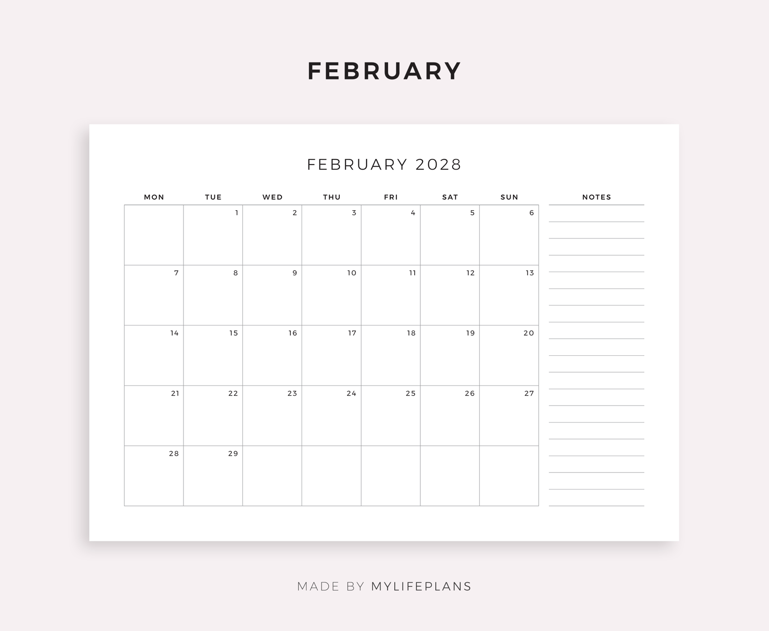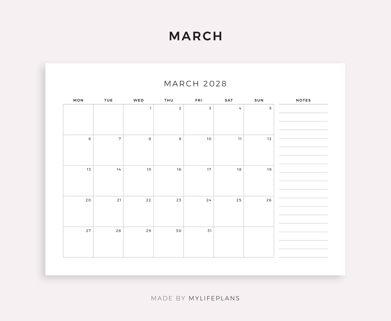 2028 Monthly Planner Landscape, Printable & Fillable, A4/Letter Size