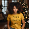 African American Woman Mustard T-shirt Christmas Holiday Mockup Photo, Christmas Holiday Background