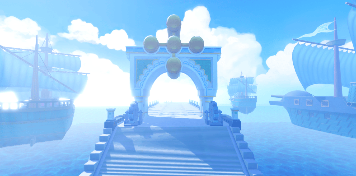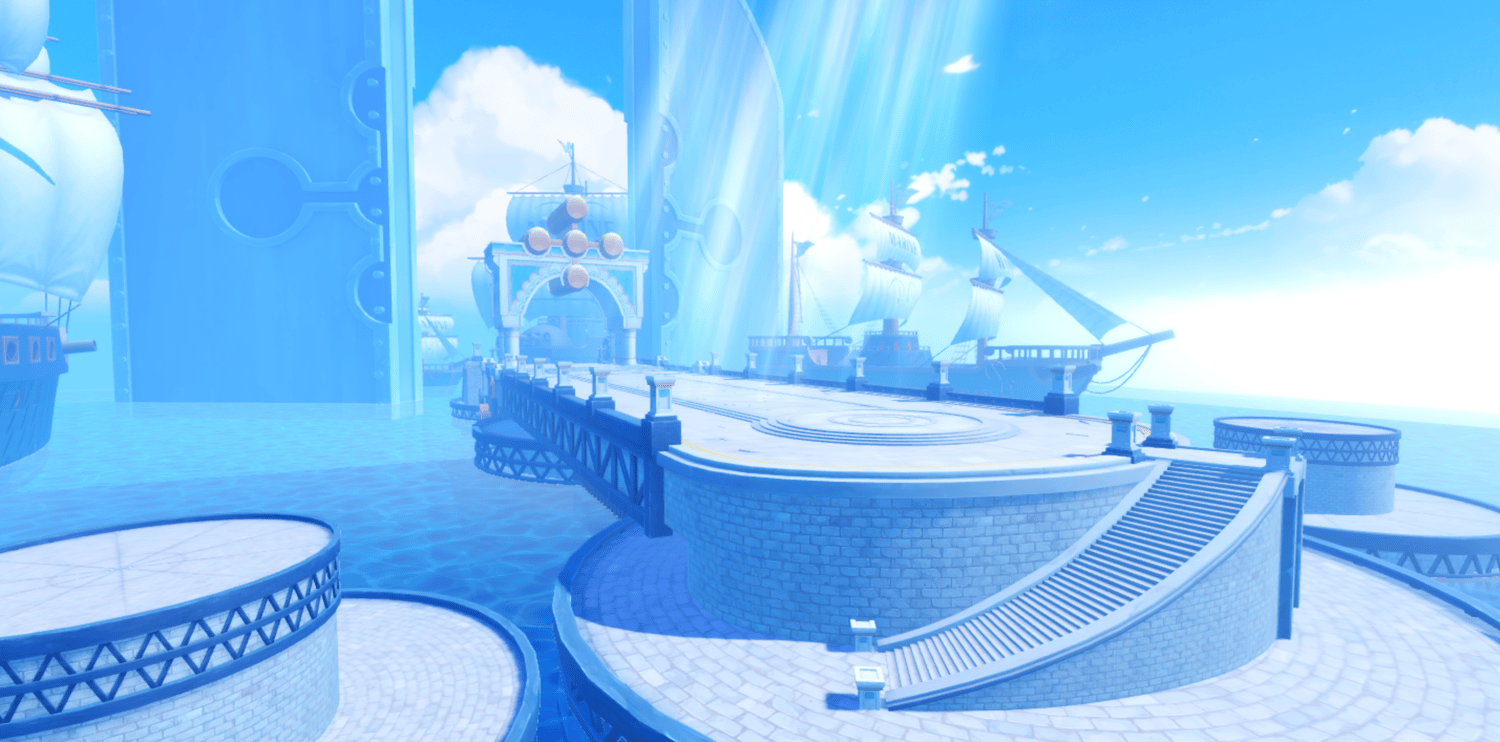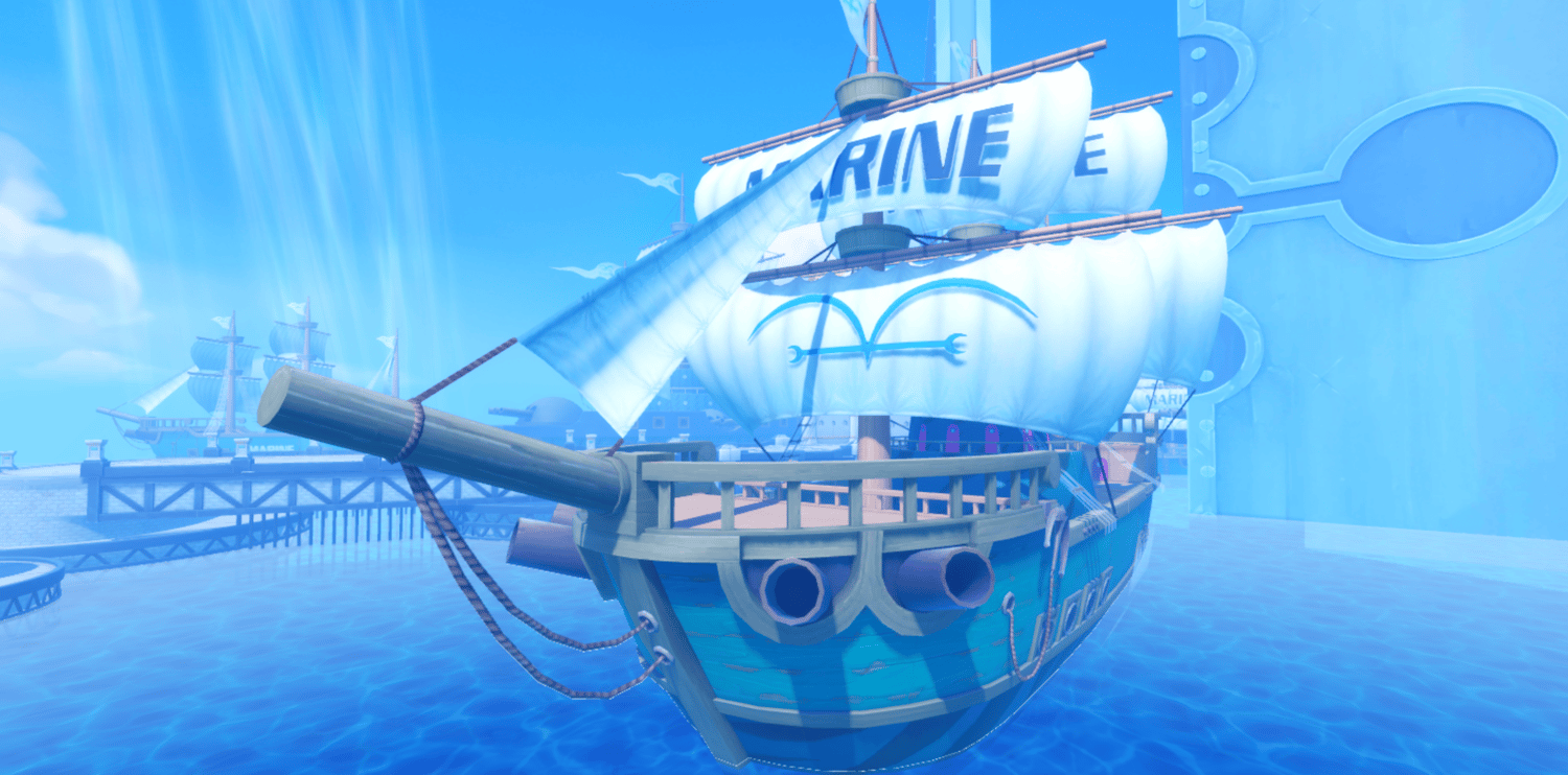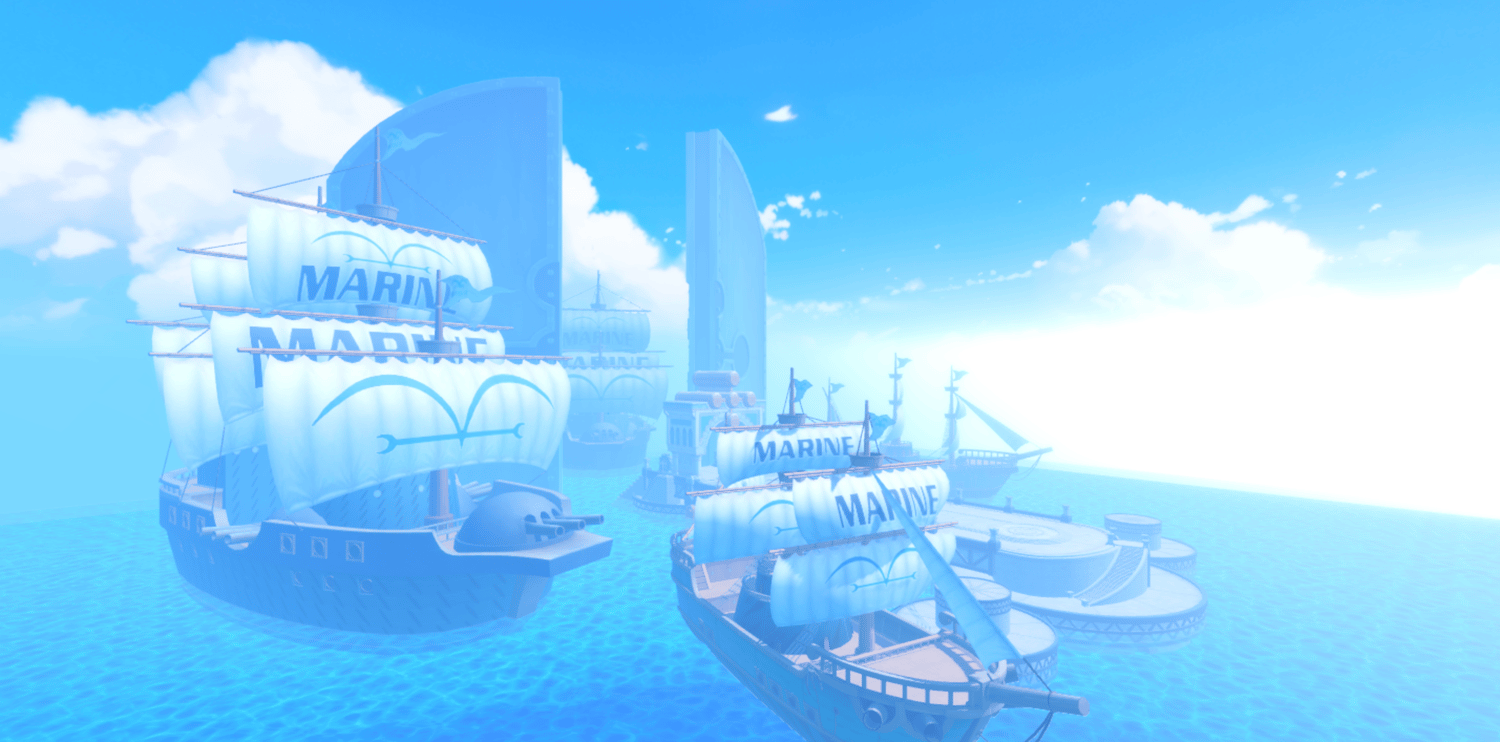 A dramatic anime-inspired Marine fortress faithfully recreating Enies Lobby from One Piece, featuring towering white fortifications, the iconic Gates of Justice archway, and detailed Marine warships docked throughout the harbor. Grand elevated platforms, curved stone walkways, and massive pillars are bathed in perpetual sunlight against brilliant blue skies and shimmering ocean waters. Volumetric lighting and saturated tones create a cinematic atmosphere capturing the scale of the original series. The layout supports seamless navigation across docks, bridges, and plazas, ideal for combat, exploration, and dramatic moments. Perfect for One Piece fan games, anime RPGs, naval adventures, roleplay worlds, or showcase builds.