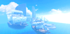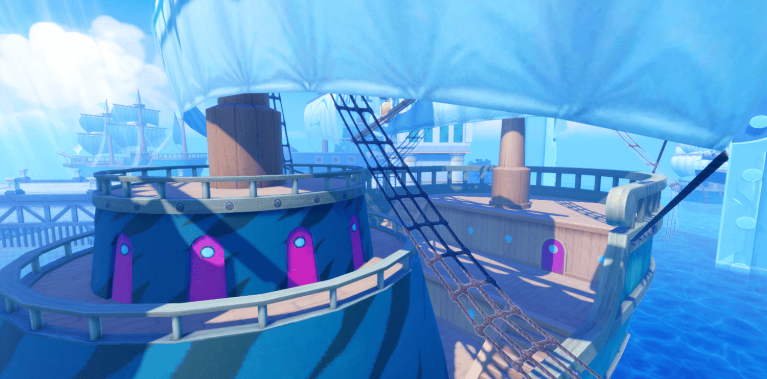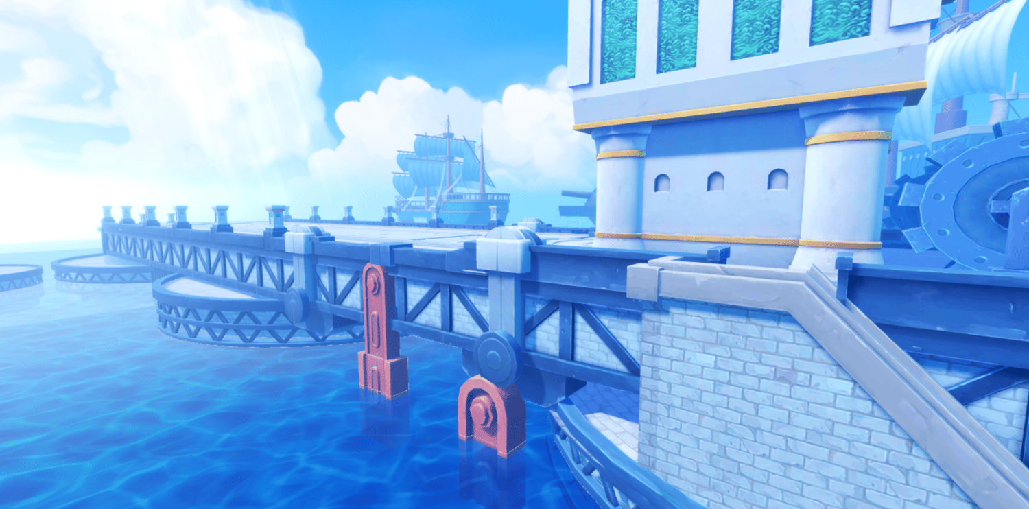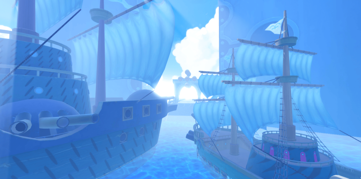 A dramatic anime-inspired Marine fortress faithfully recreating Enies Lobby from One Piece, featuring towering white fortifications, the iconic Gates of Justice archway, and detailed Marine warships docked throughout the harbor. Grand elevated platforms, curved stone walkways, and massive pillars are bathed in perpetual sunlight against brilliant blue skies and shimmering ocean waters. Volumetric lighting and saturated tones create a cinematic atmosphere capturing the scale of the original series. The layout supports seamless navigation across docks, bridges, and plazas, ideal for combat, exploration, and dramatic moments. Perfect for One Piece fan games, anime RPGs, naval adventures, roleplay worlds, or showcase builds.