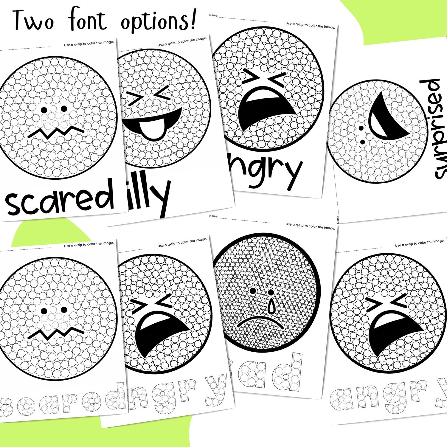 This set features emotion emoji faces designed for q tip painting. Students use cotton swabs to dot and color each emotion while discussing what that feeling looks like and when they might experience it.