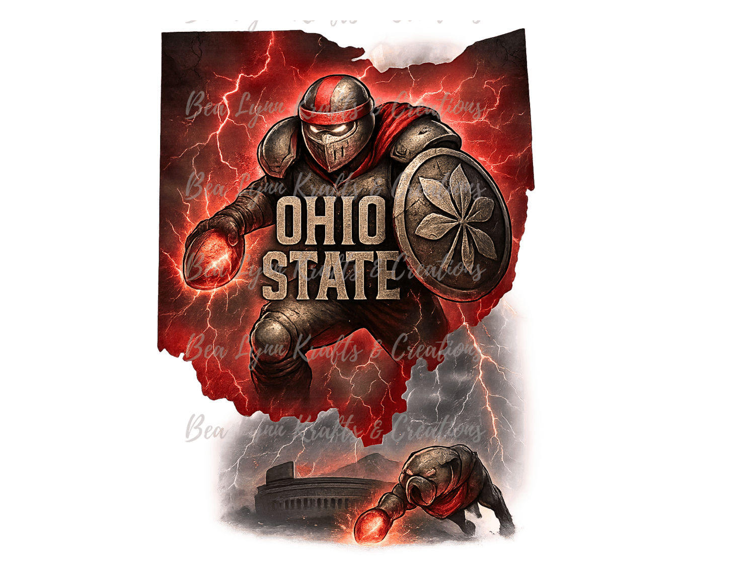 BUCKEYE NATION—GET READY TO DOMINATE! This electrifying transparent PNG captures the raw, relentless energy of Ohio State football like never before. Featuring a powerful, armored Brutus-inspired warrior bursting from a cracked Ohio state silhouette, this design fuses scarlet-and-gray storm textures with game day fire. Sparks fly as the warrior charges forward wielding a glowing football and a shield etched with the Buckeye leaf. The iconic Horseshoe Stadium subtly anchors the base of the design. From tradition to total takeover, this image is built for fans who bleed scarlet and gray.