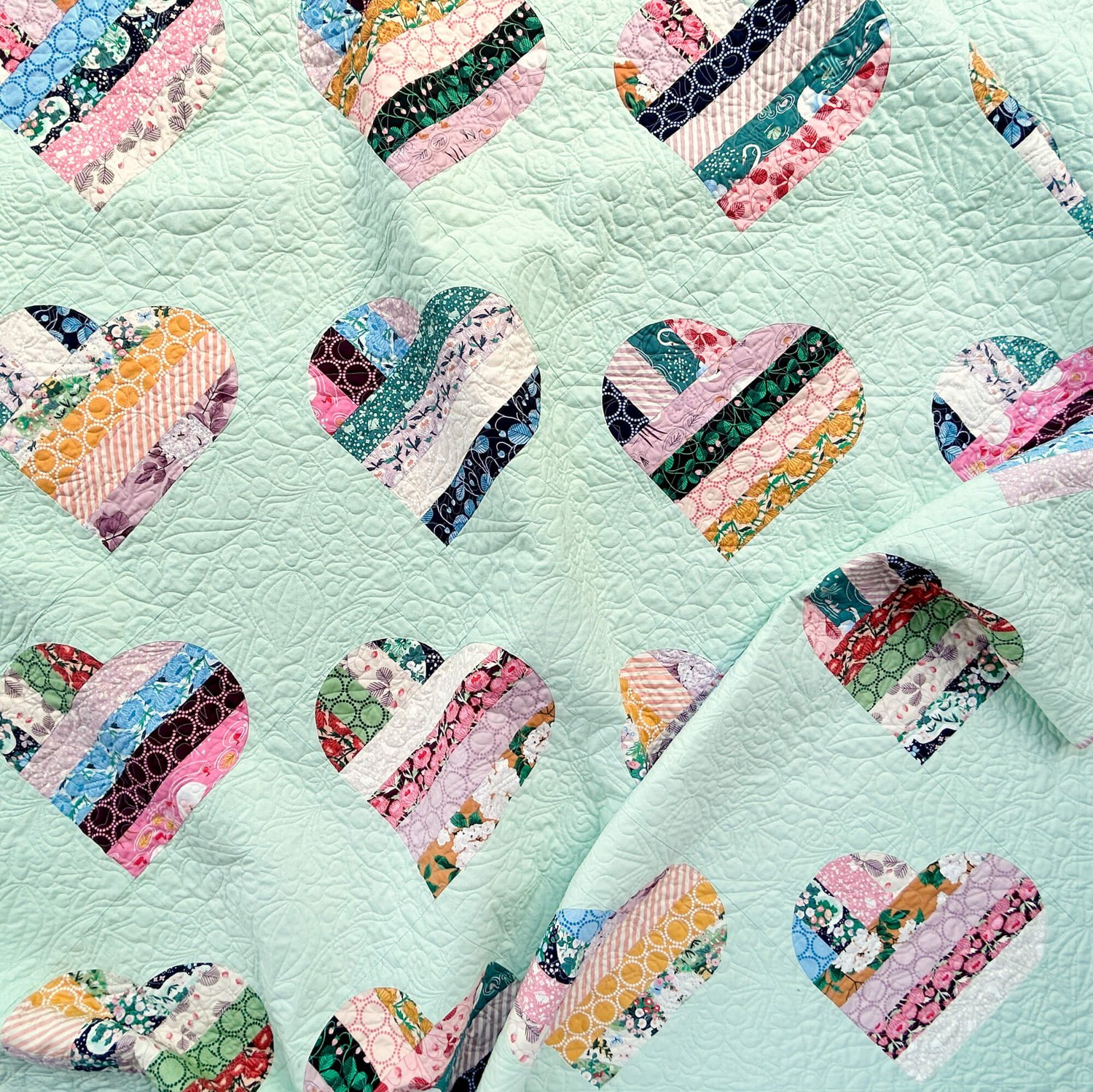 This modern curved piecing quilt pattern is precut friendly, so find your favorite fabric roll (jelly roll), and let’s make hearts! Precut strips and 12" blocks make this pattern a quick make. New to curves? Find extra linked tutorials in the PDF pattern to guide you through curved piecing.