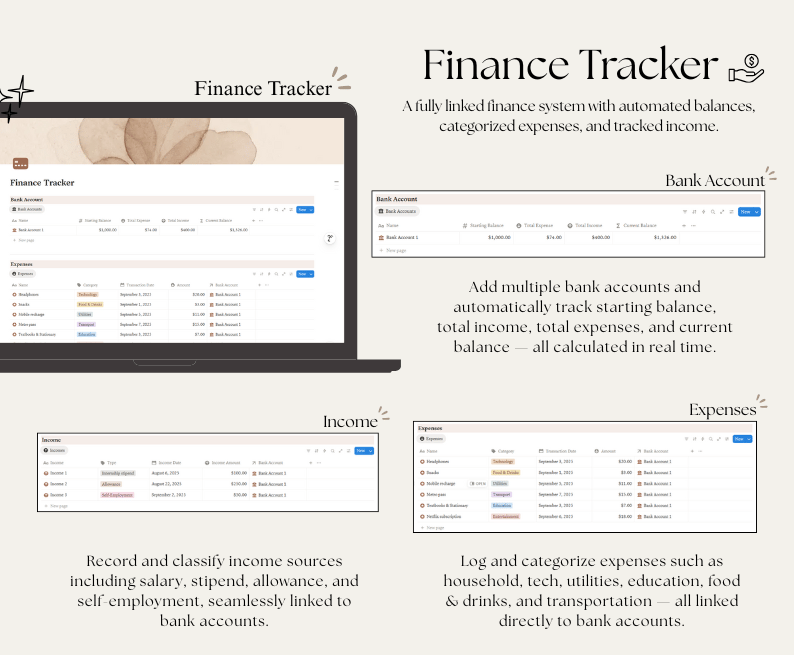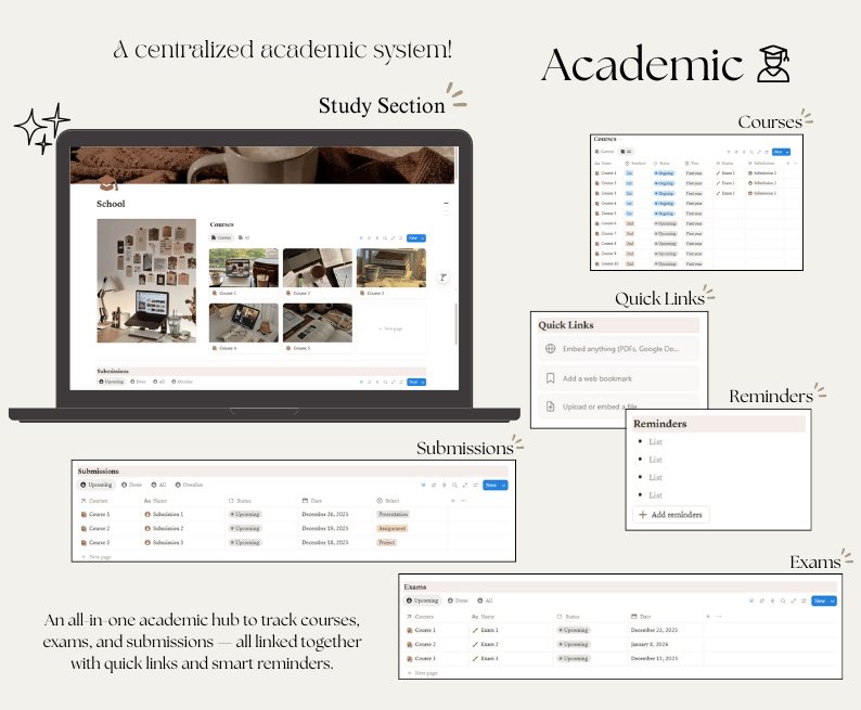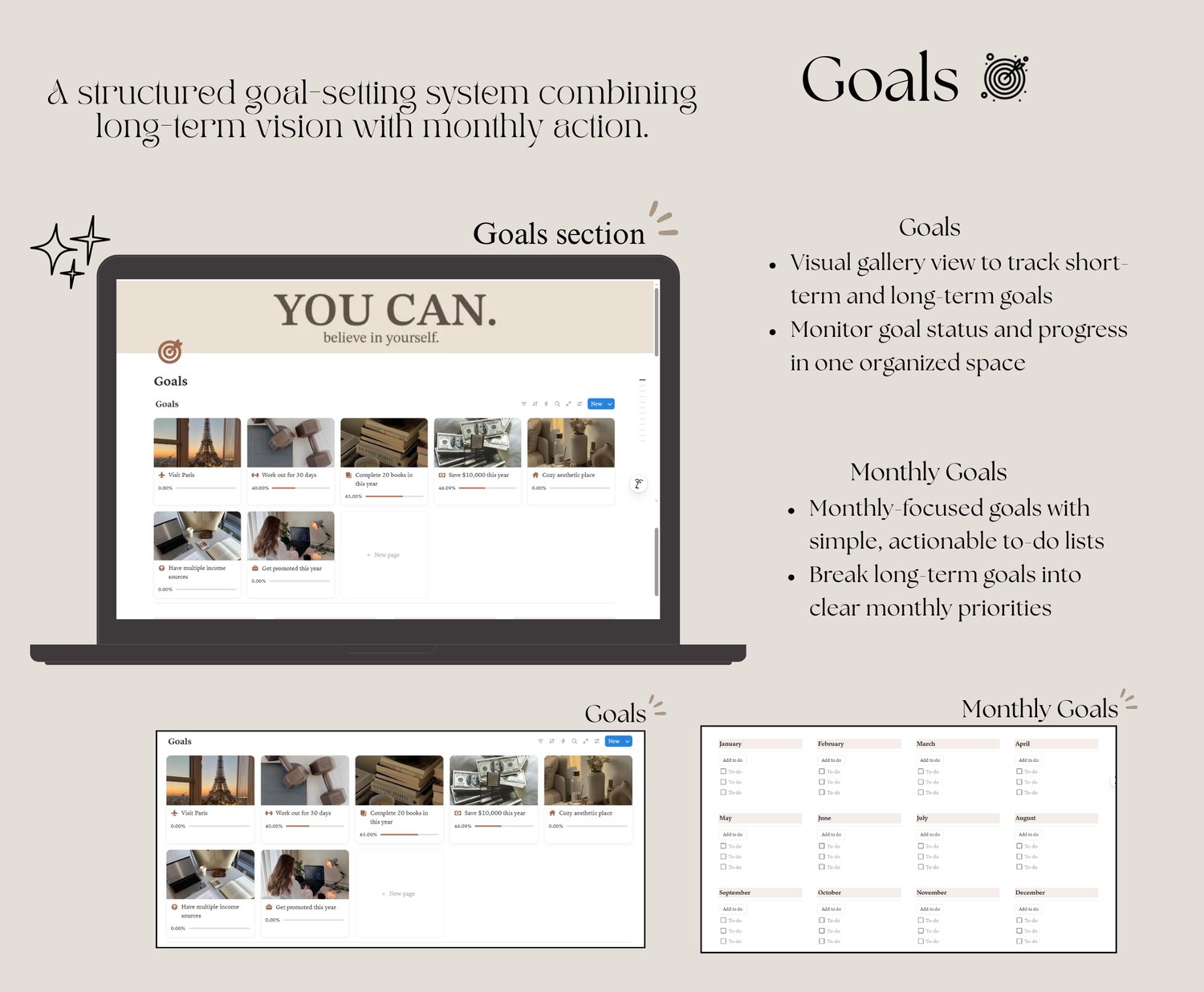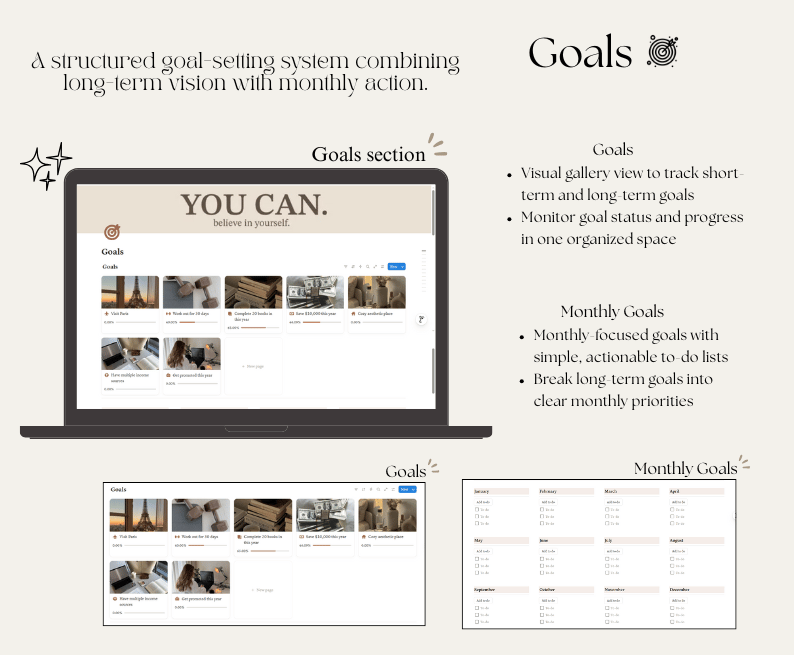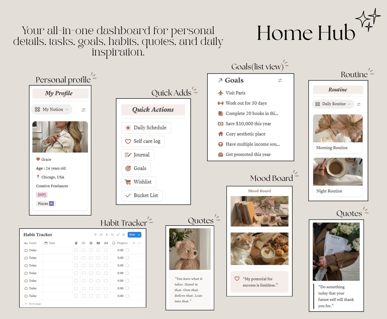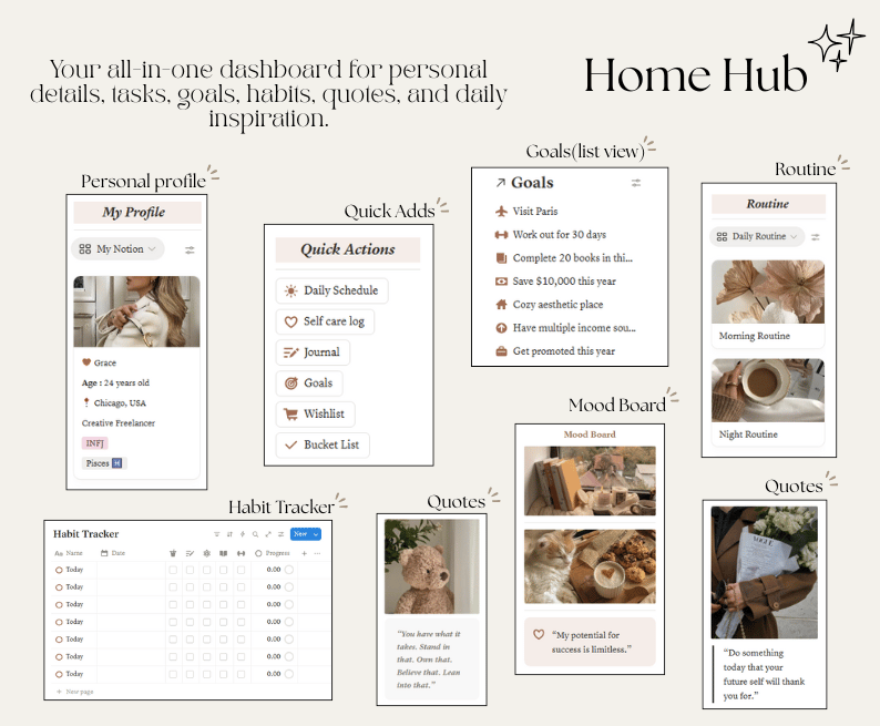 - A single aesthetic workspace to manage your daily life, goals, wellness, and routines.