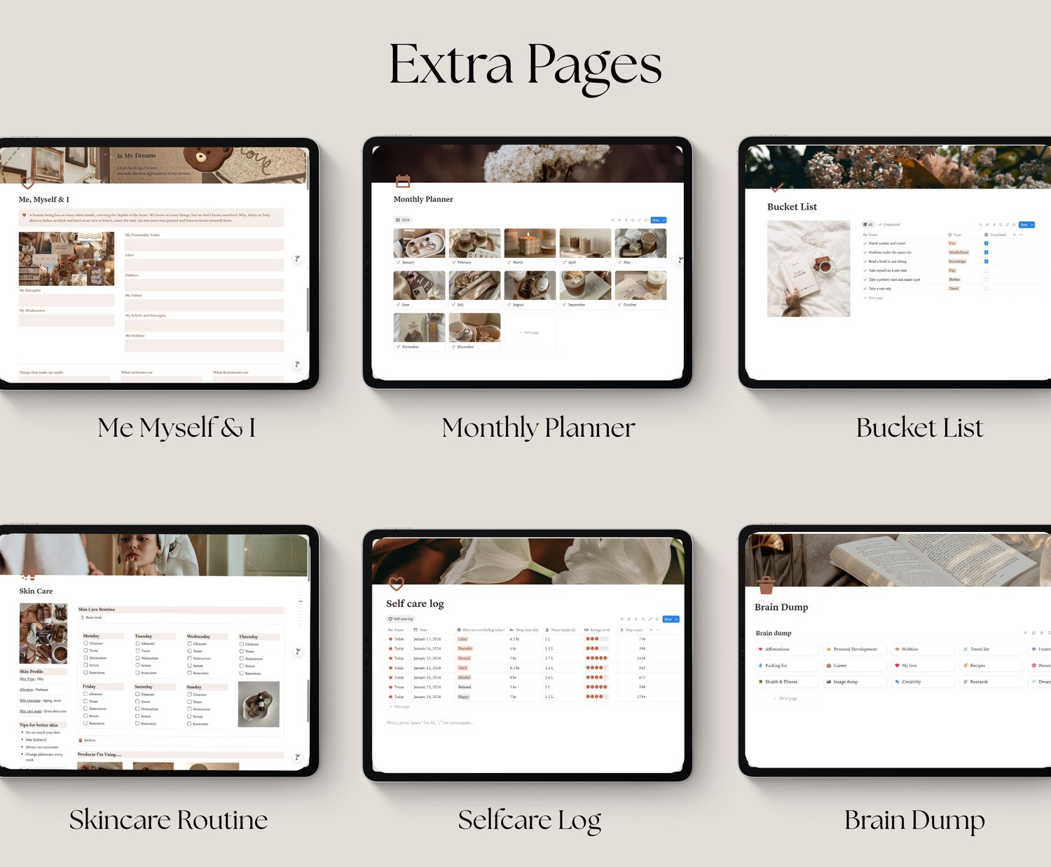 - Includes self-care logs, skincare tracking, and wellness reflection spaces.