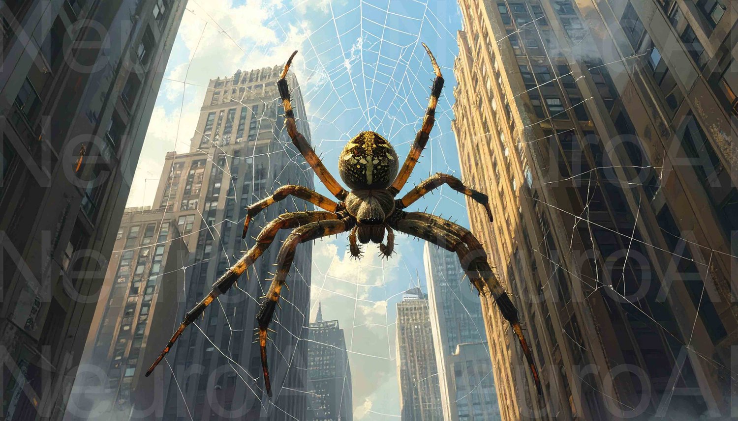 Giant spider looms over city skyline on web