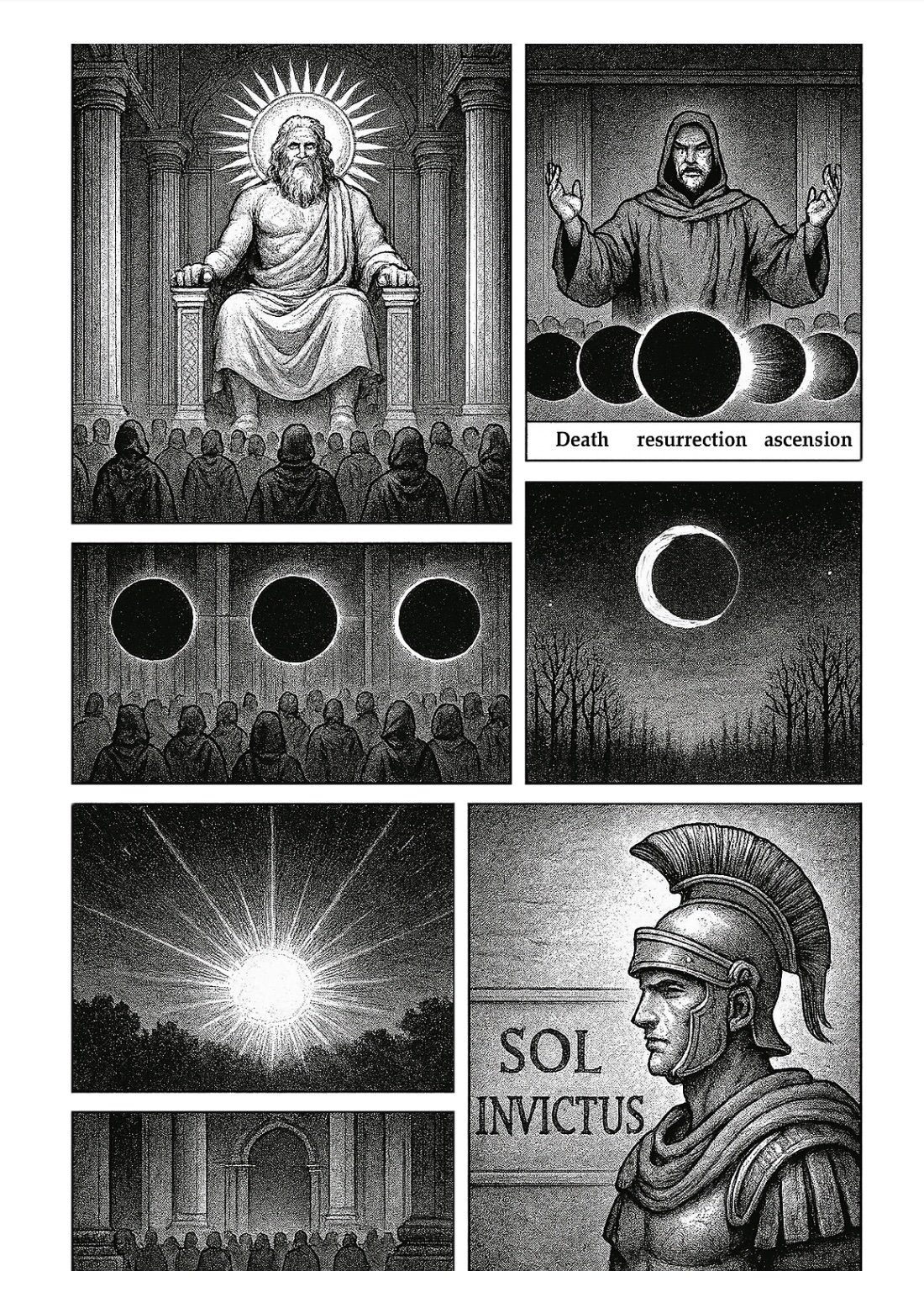 El hijo elegido del Padre de Todo: El Dios Sol es un cómic ilustrado que te invita a este relato cósmico, donde la astronomía se entrelaza con el mito antiguo, donde la cruz en el cielo marca el reposo de la luz, y donde el solsticio anuncia la esperanza del renacimiento.