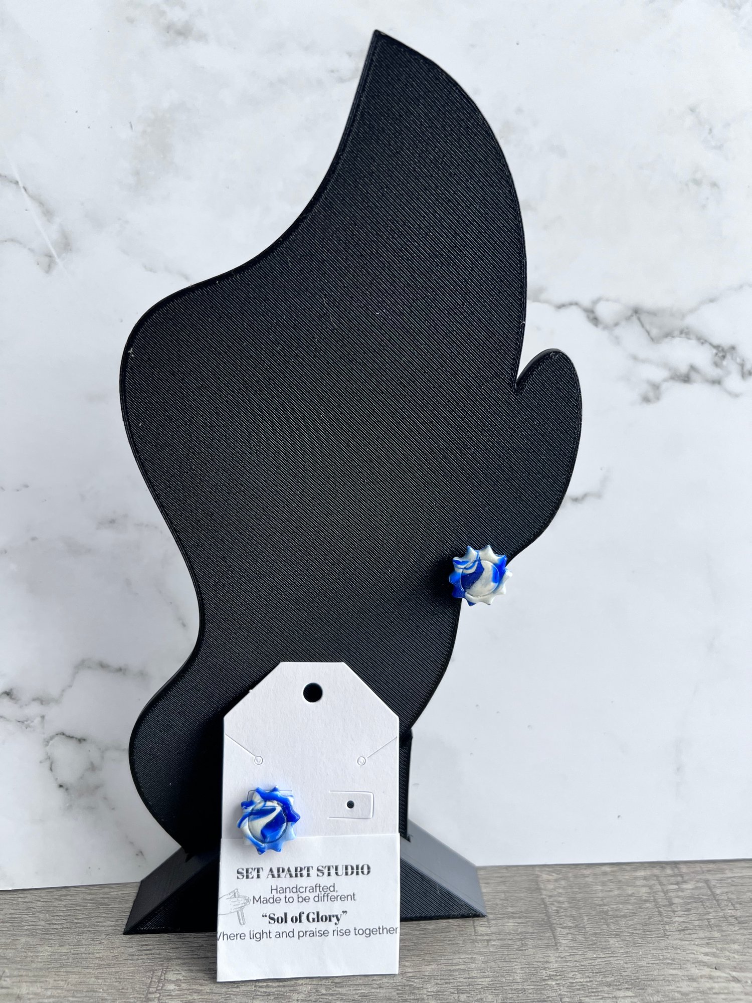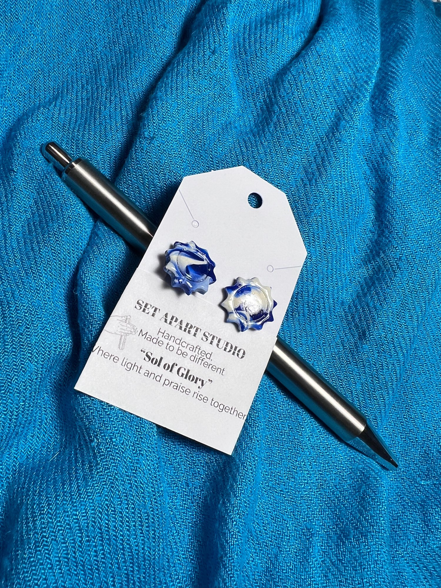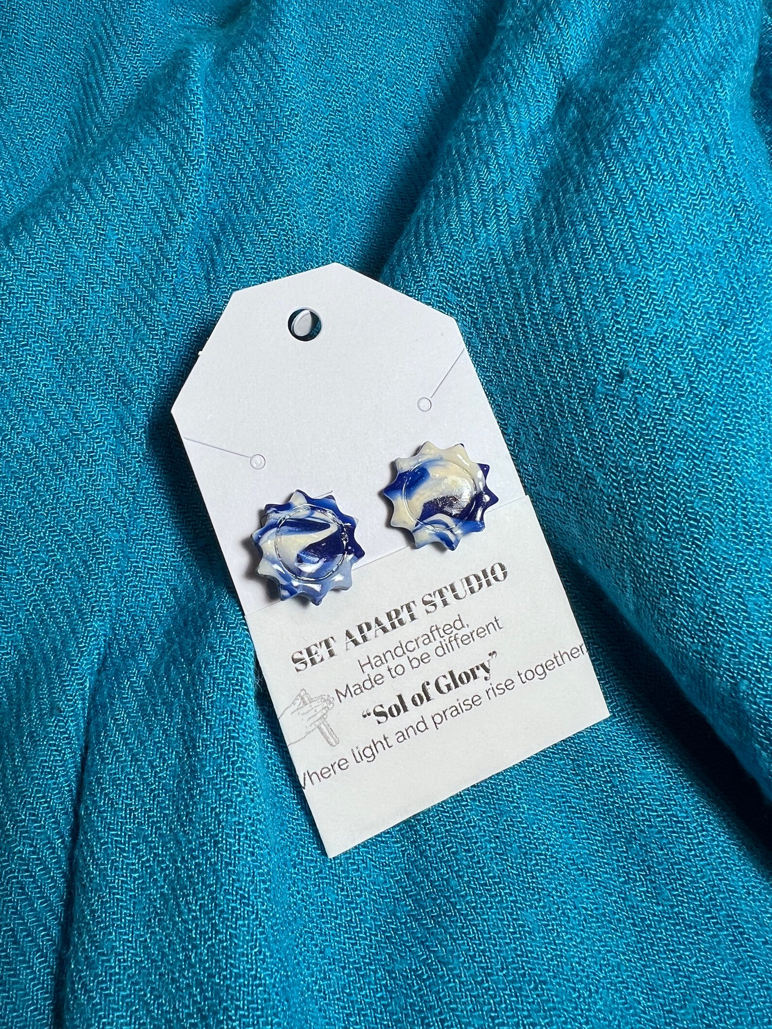 ✅ Sun-Inspired Clay Studs – Sculpted in a radiant sun shape with hand-blended swirls of deep blue and white. Each pair is one-of-a-kind, just like your calling.