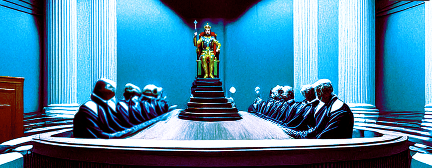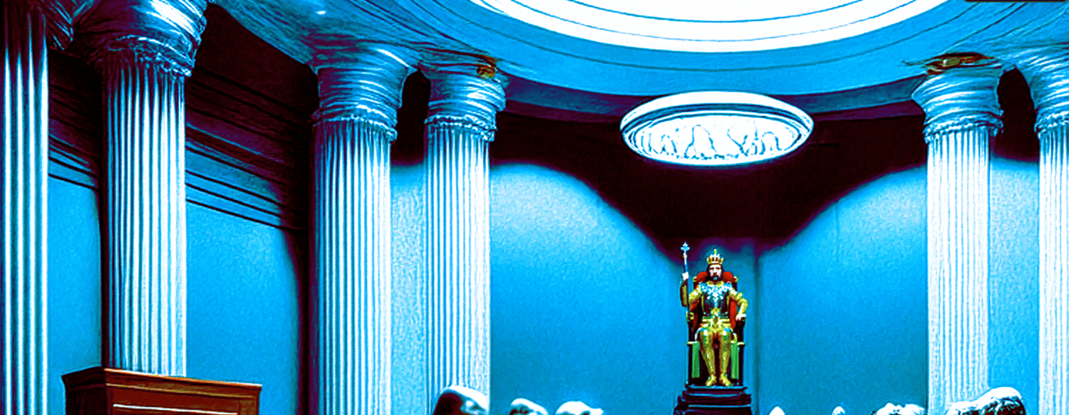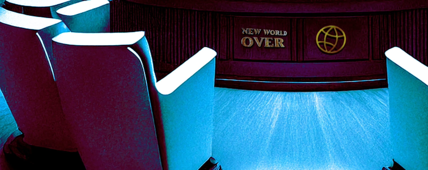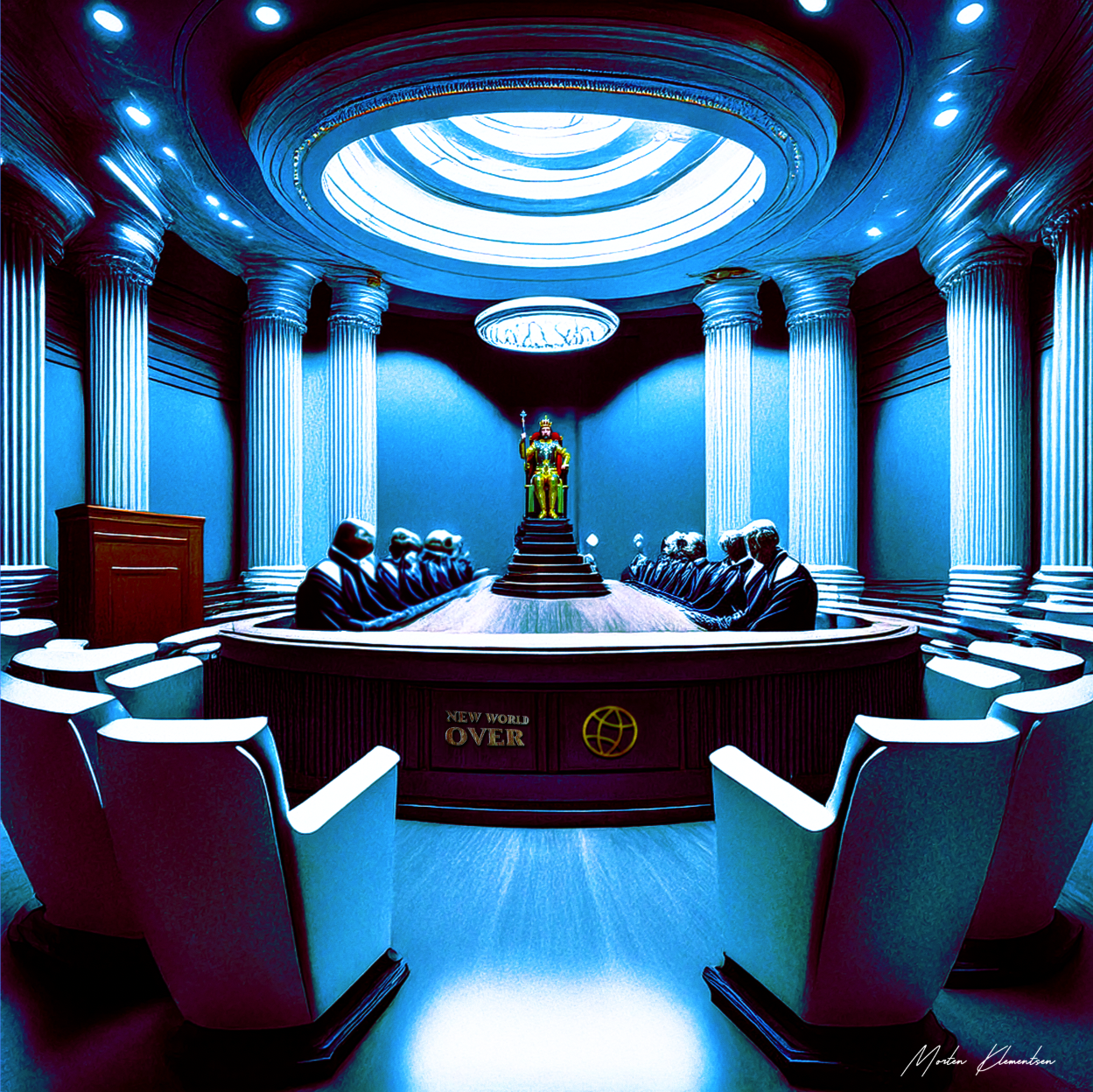 "NEW WORLD OVER" is a digital artwork that presents a chilling vision of the future, where a council of powerful men (with the exception of one woman) has assumed control above the laws of individual states. The central figure, dressed in an emperor's attire and seated on a throne, symbolizes the concentration of authority in the hands of a ruling elite.