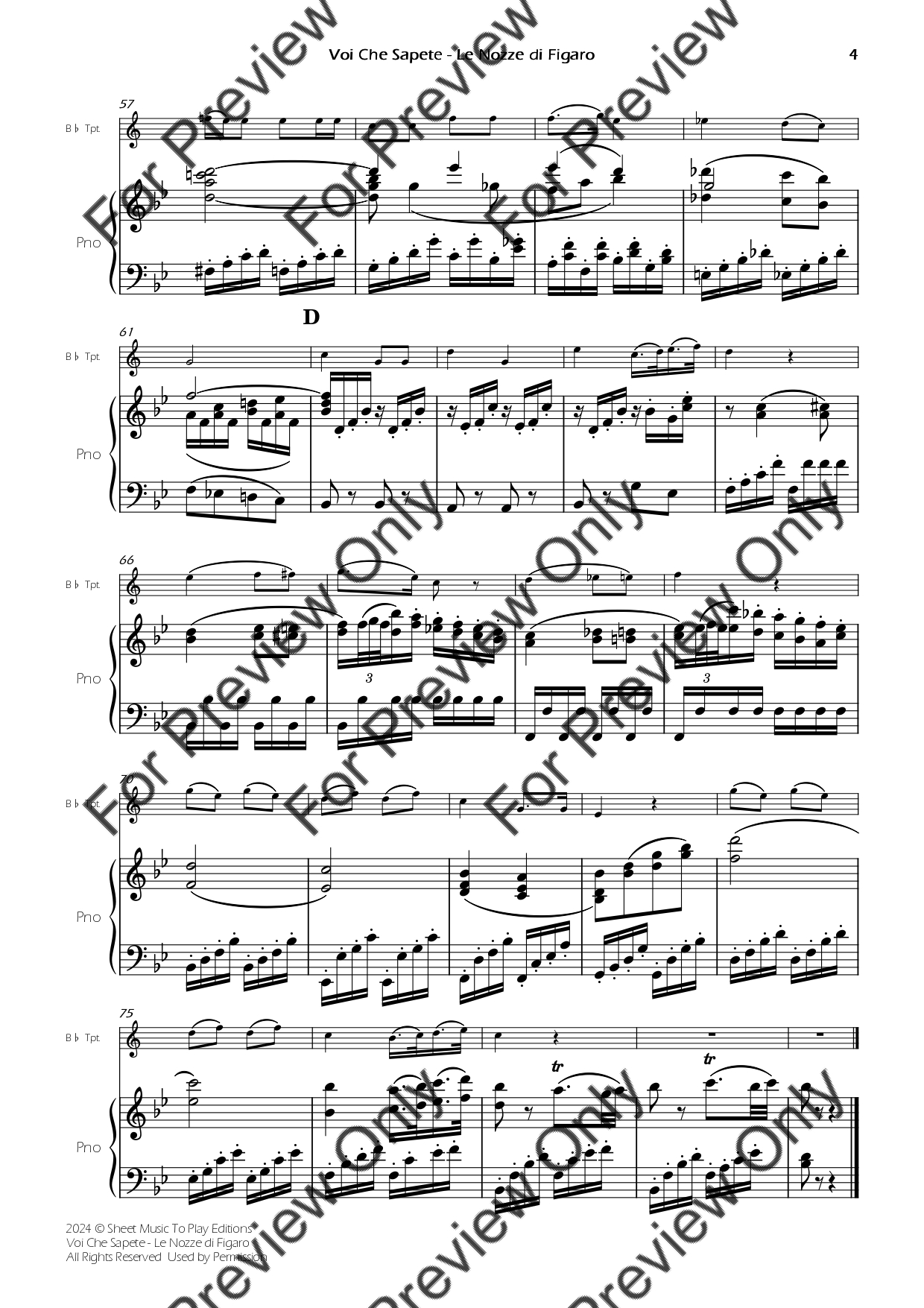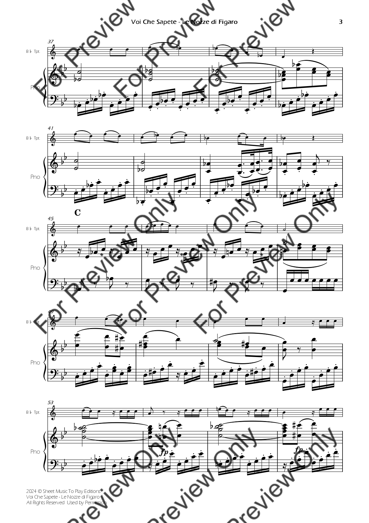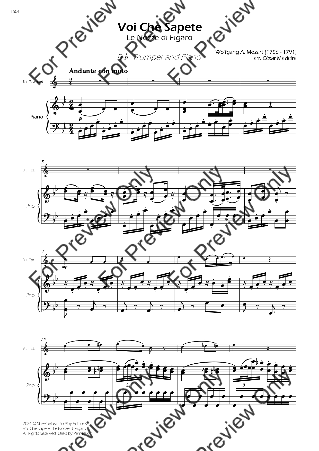 Voi Che Sapete from The Marriage Of Figaro by Wolfgang Amadeus Mozart. Arrangement for Bb Trumpet and Piano. With Full Score and Individual Parts. Have fun!