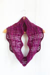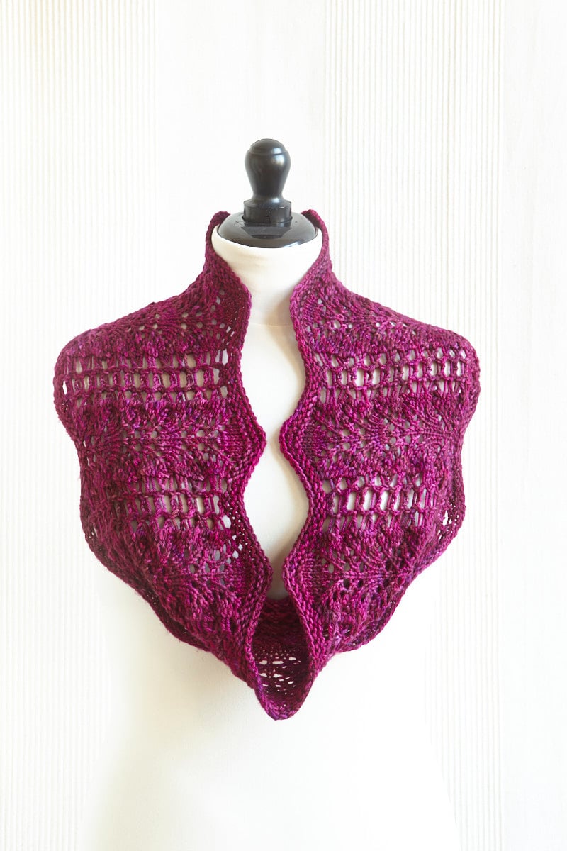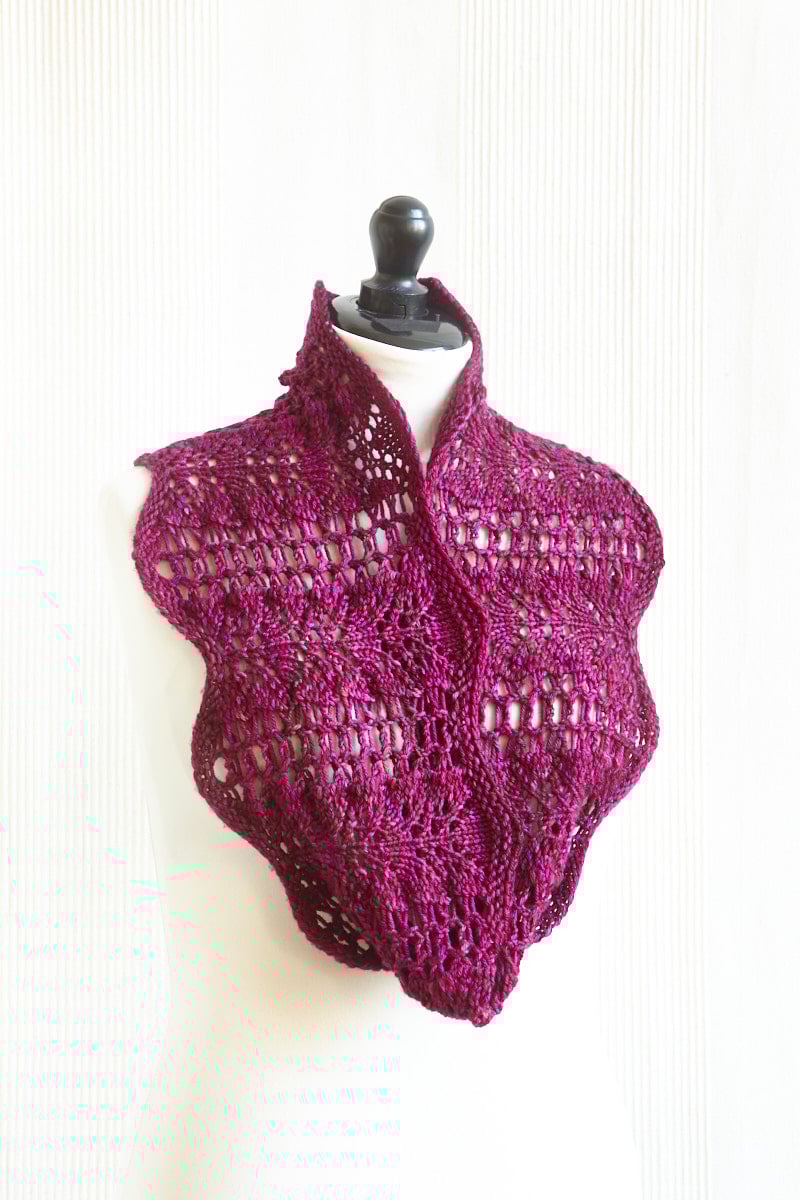 The Zerrélia cowl captures this interplay of organic forms and rhythmic structure. Fountain-like lace patterns rise like fern fronds, while columns of double yarn-overs create the airy transparency of glass walls. The rich magenta colorway echoes the deep hues of exotic blooms tucked among the greenery. Each stitch builds upon the last, architectural yet organic. Step into your own glass sanctuary, where light and lace intertwine.