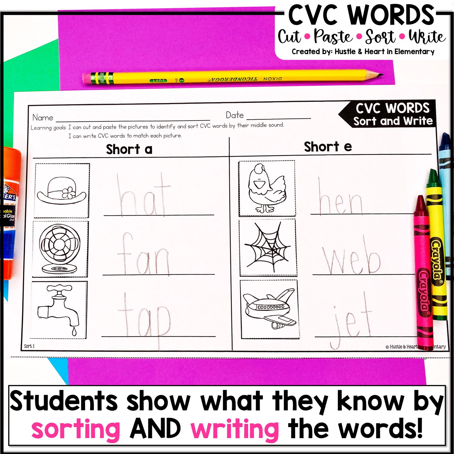 This fun and engaging resource will help your students master their CVC words. Helping to make CVC writing and practice easier for students and teachers, these no-prep worksheets take the simple cut and paste sorts to a new level by including a writing aspect to the sort. They are the perfect way to practice identifying middle sounds in CVC words as well as to write CVC words.