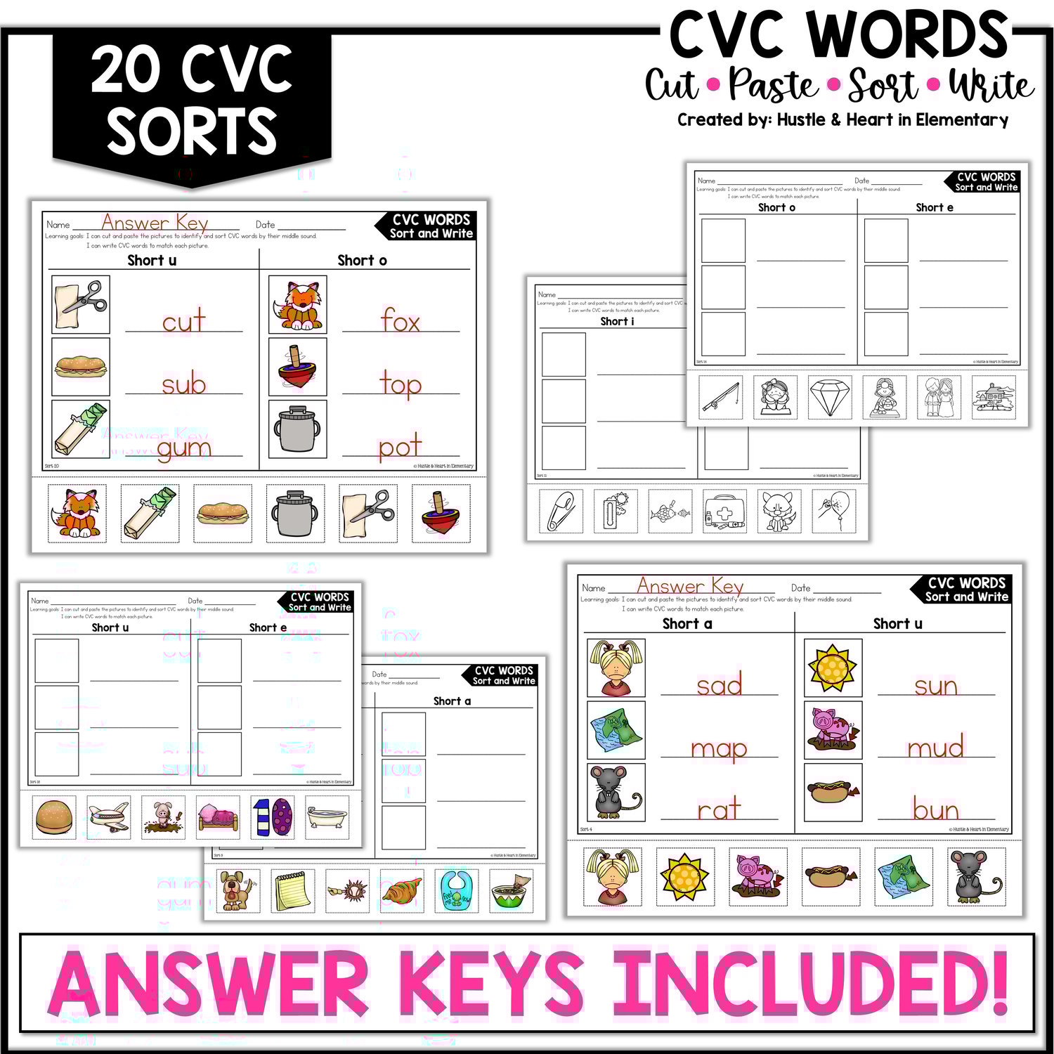Included in this resource are 20 no-prep cvc word sorts in both color and black and white print options. Students will practice identifying short vowels in words by sorting cvc word pictures and writing those words. An answer key is provided for each sort activity to make it clear which cvc word the pictures are intended to represent.
