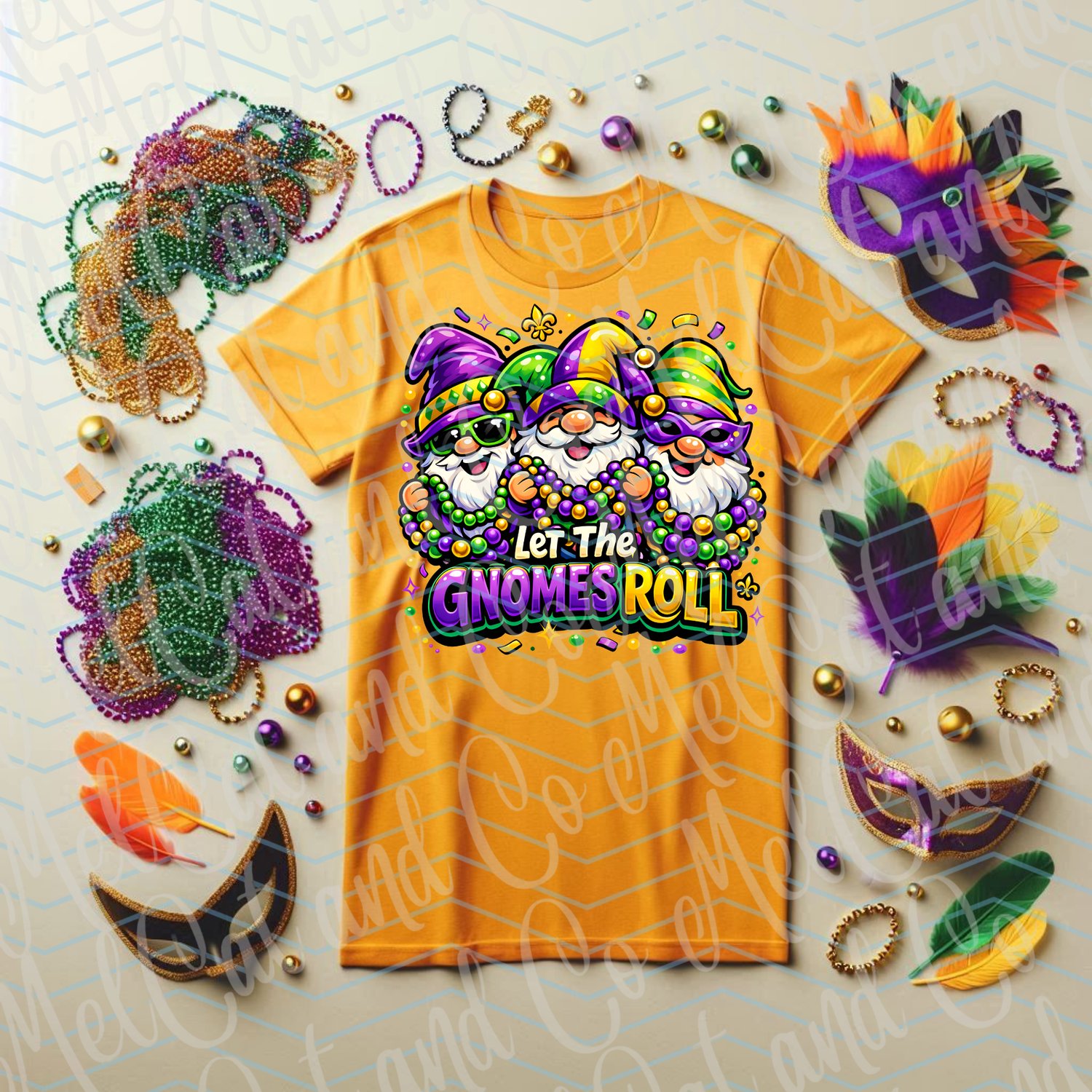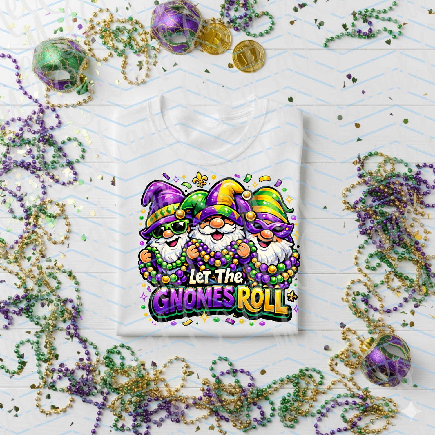 Bring the spirit of Mardi Gras to life with this bold, playful “Let the Gnomes Roll” digital design featuring three festive gnomes decked out in classic purple, green, and gold. Complete with bead necklaces, jester hats, and joyful expressions, this high-impact graphic is perfect for celebrating carnival season in style.