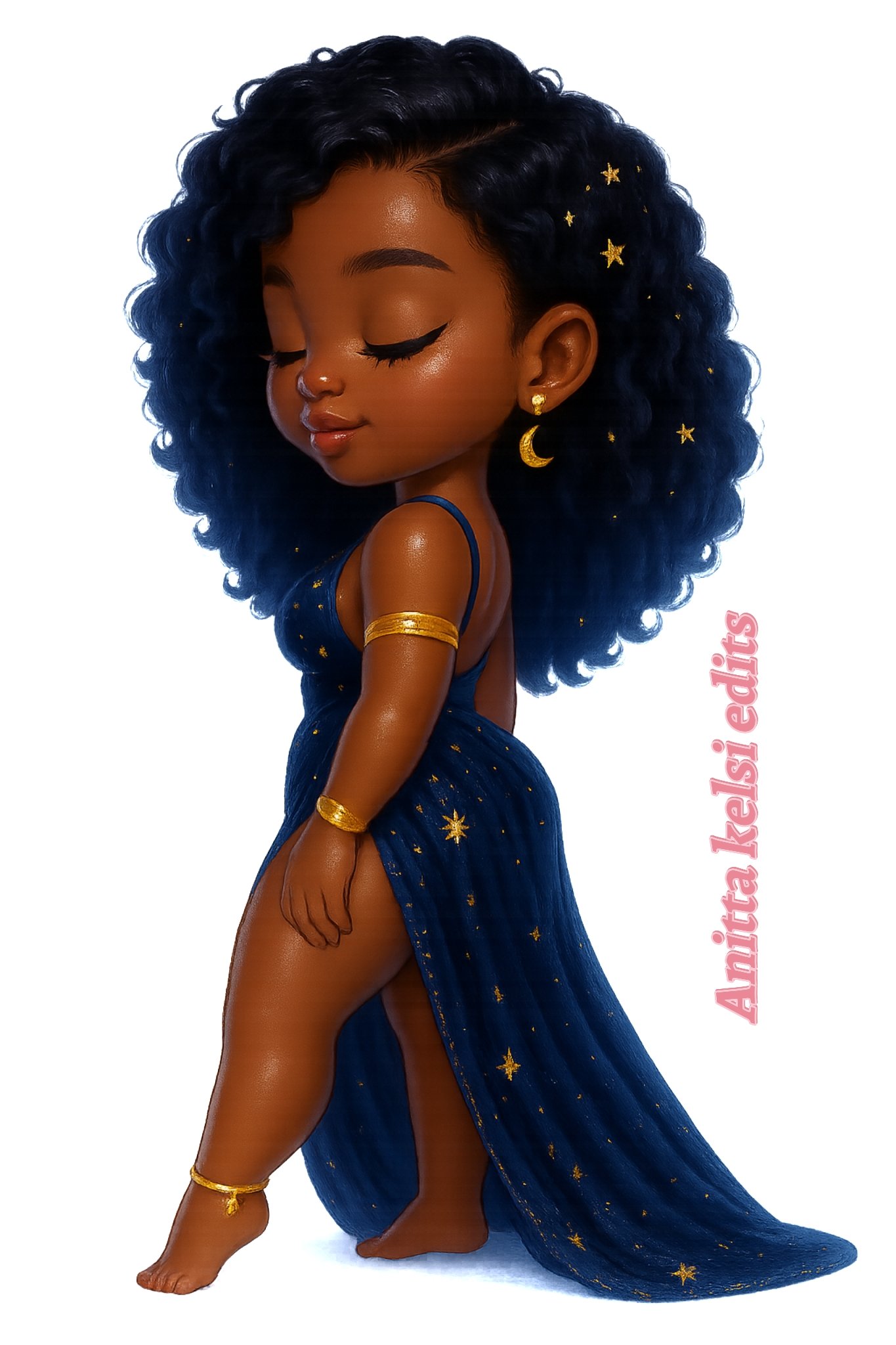 Step into the cosmos with Celestial Grace, a hyper-realistic chibi artwork that radiates divine confidence and elegance. This stunning chibi features an ultra-curvy silhouette with deep, radiant melanin skin, dressed in a flowing navy silk gown adorned with golden stars. Her voluminous curls sparkle with celestial accents, and her pose is both graceful and powerful.