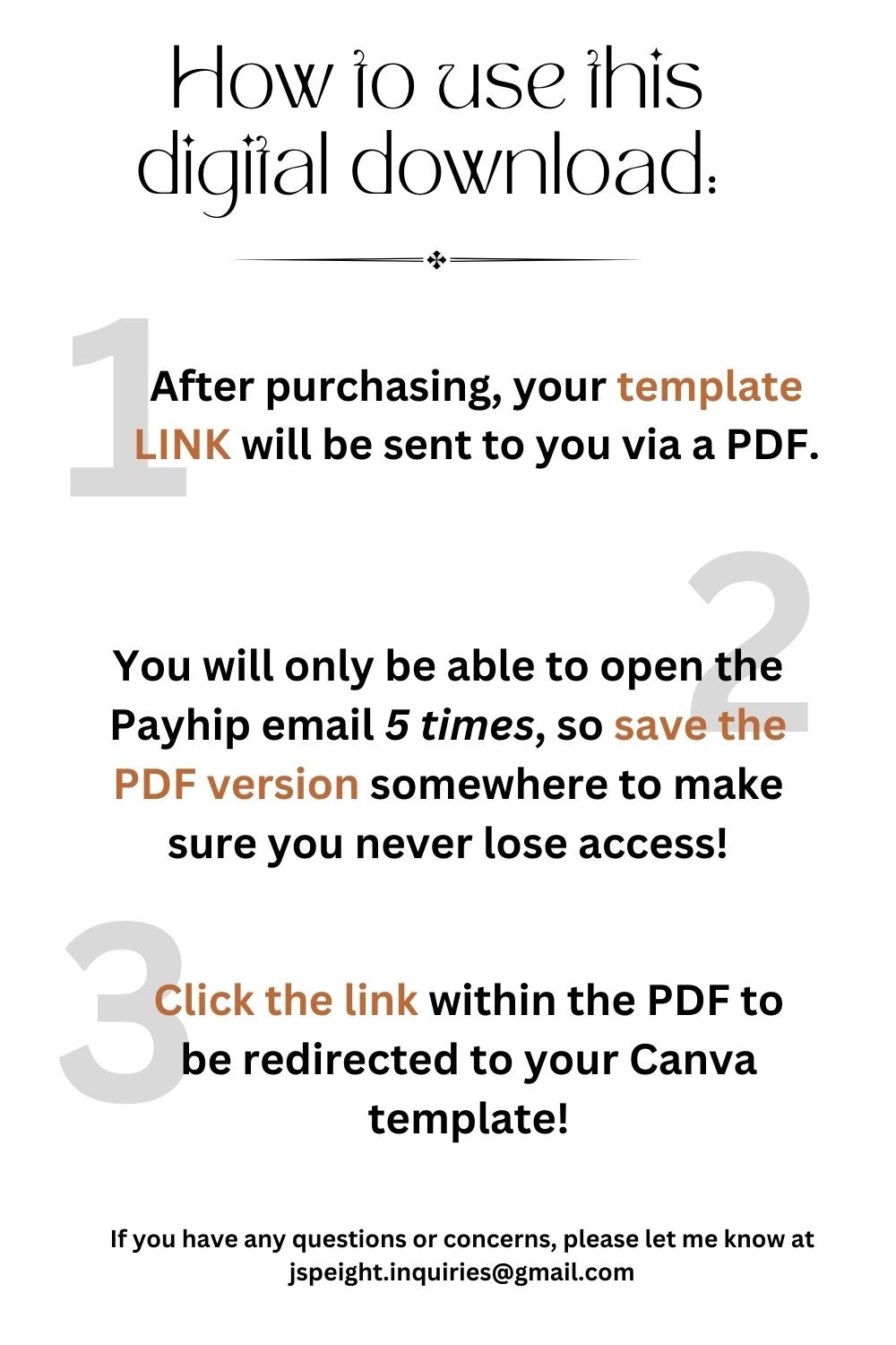 NOTE: The digital download link received from PayHip is only accessibly 5 times. Please be sure to save the pdf so that you always have access to your canva template.