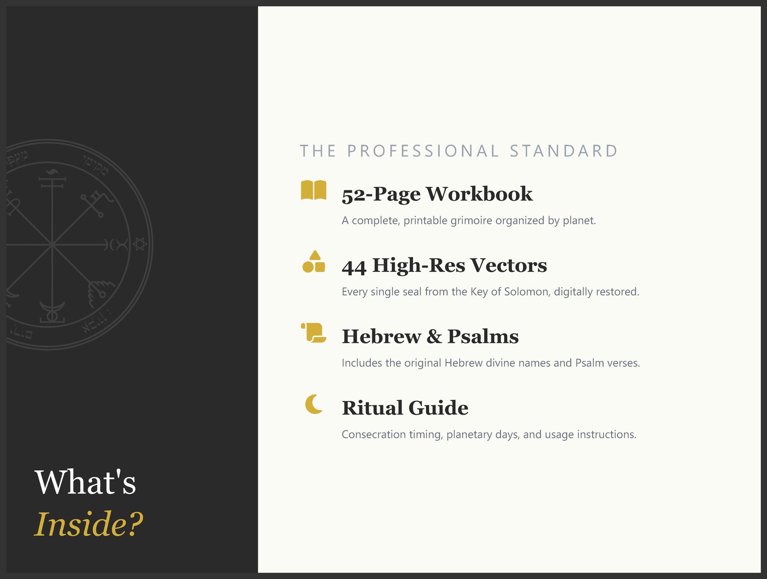 Master the art of planetary magic with this complete Seals of Solomon Workbook. This 52-page digital grimoire provides a structured, step-by-step guide to crafting and consecrating all 44 planetary talismans found in the Key of Solomon.