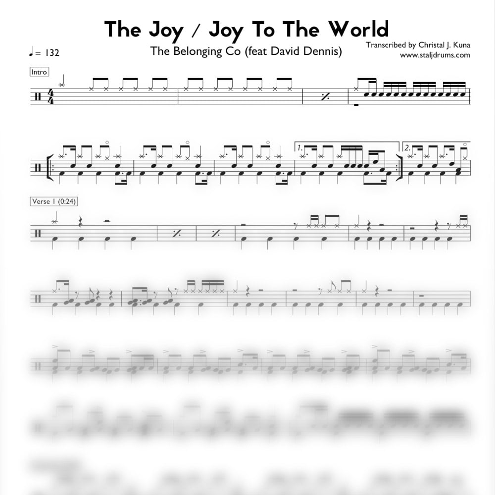 Drum sheet music for The Joy / Joy To The World (feat. David Dennis) by The Belonging Co, formatted by section and with timestamps.