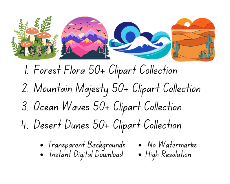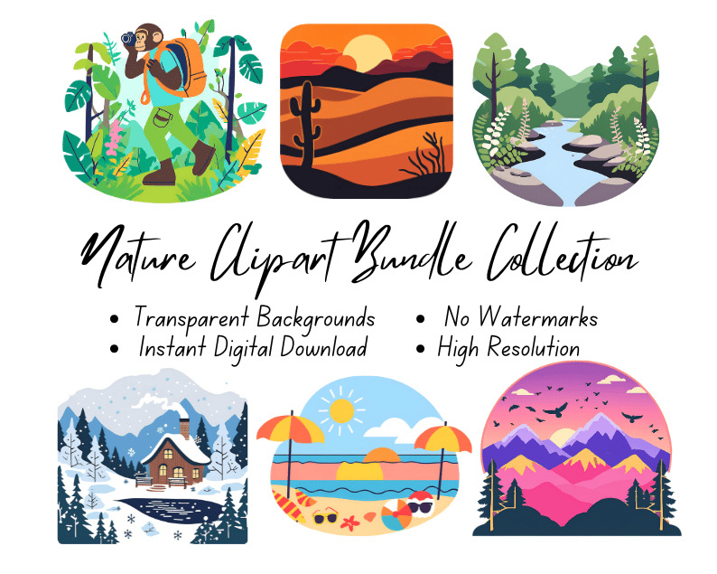 The Nature Clipart Bundle is the ultimate collection for all nature enthusiasts and designers. With over 500 high-resolution clipart illustrations, this bundle captures the beauty and diversity of nature through stunning and versatile designs. Each set showcases a unique aspect of the natural world, from lush forests to serene oceans and snow-covered landscapes. Perfect for use in various creative projects, including invitations, posters, websites, stationery, scrapbooking, and much more. All clipart comes as digital files with a high resolution, ensuring quality and clarity for your designs.