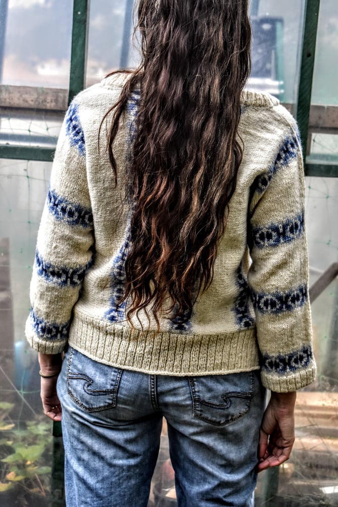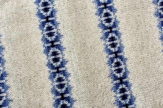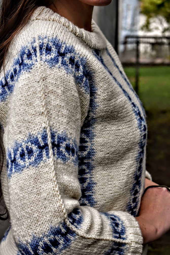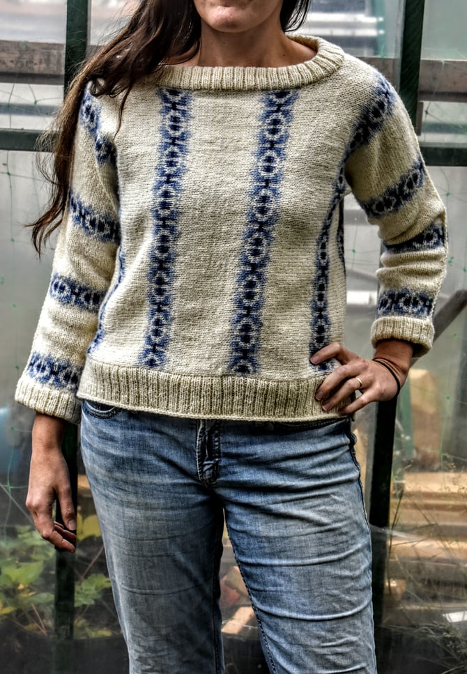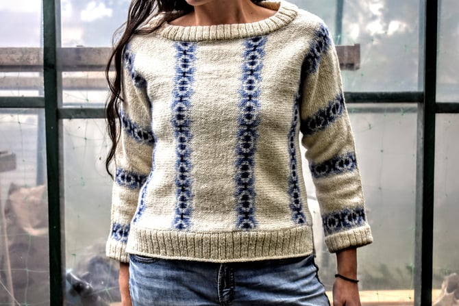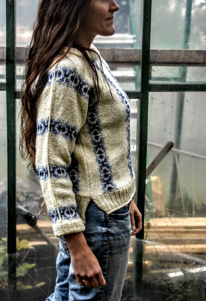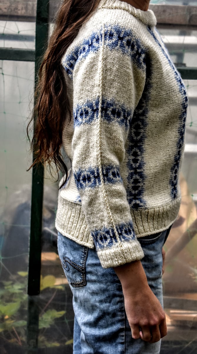 Domino is a fun stranded pullover to showcase Fleece & Harmony’s new gradient sets. The sweater is started at the centre with a provisional cast-on and worked sideways, centre-out to cuffs, with a steek at the neck and a steek at the hem. The sides are closed with a 3-needle bind-off and then the stranded patterning continues into the sleeve.