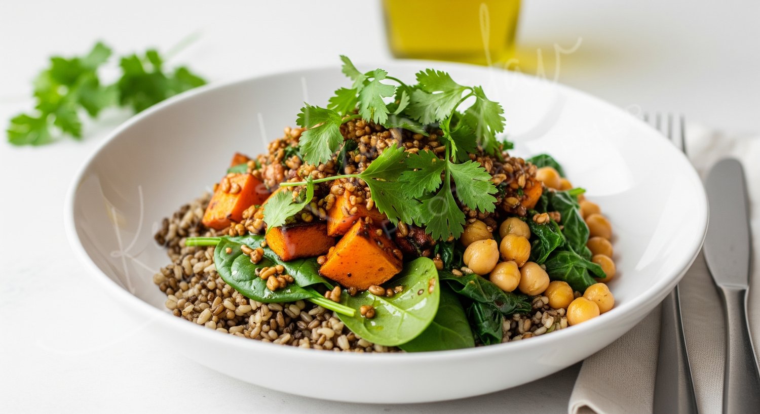 Fuel your creative projects with the ultimate plant-based visual. This high-resolution photograph features a wholesome warm grain bowl, combining fiber-rich whole grains with caramelized roasted sweet potato, protein-packed chickpeas, and fresh wilted spinach. Garnished with aromatic cilantro, it’s a masterpiece of texture and balanced nutrition.
