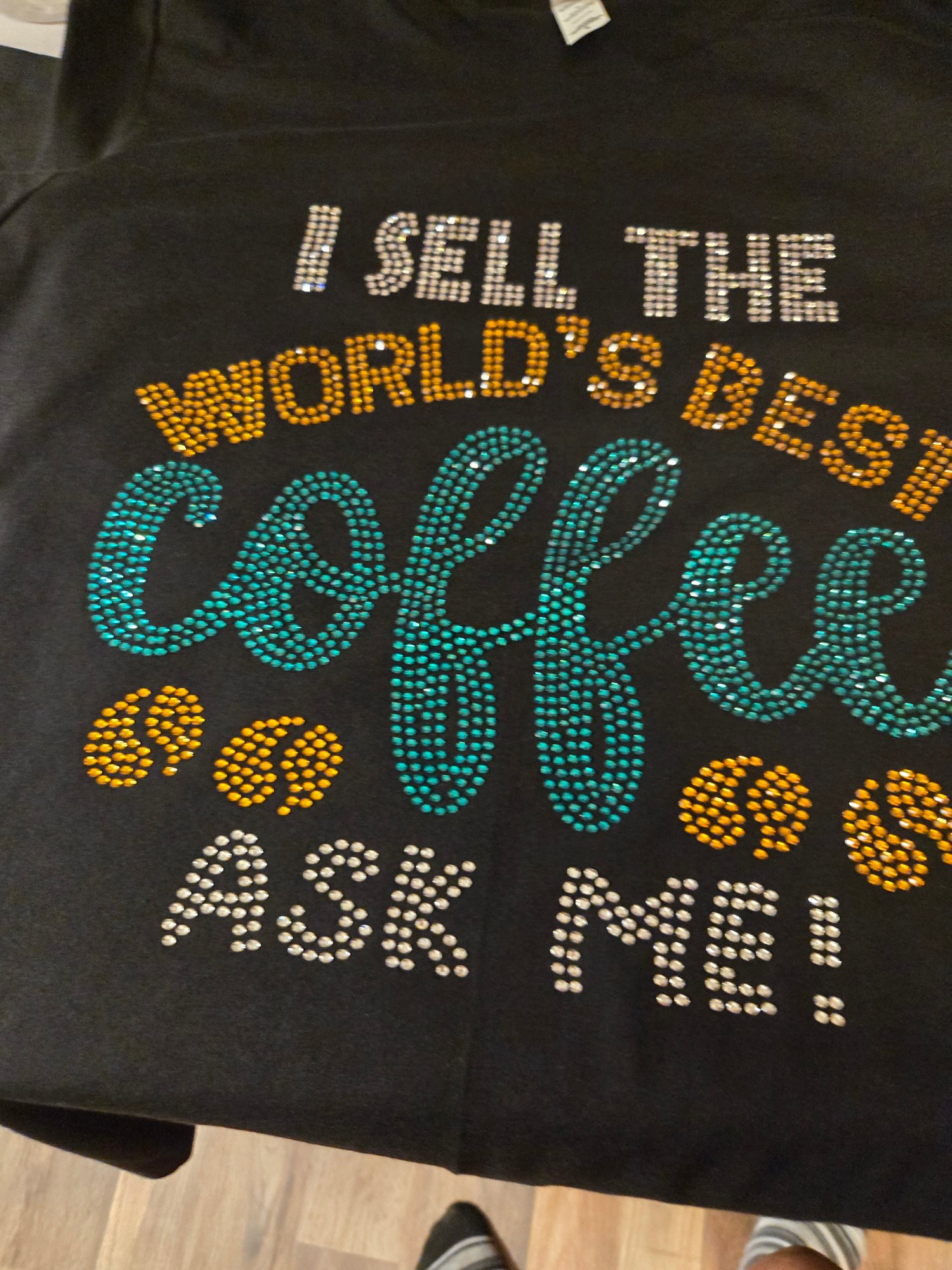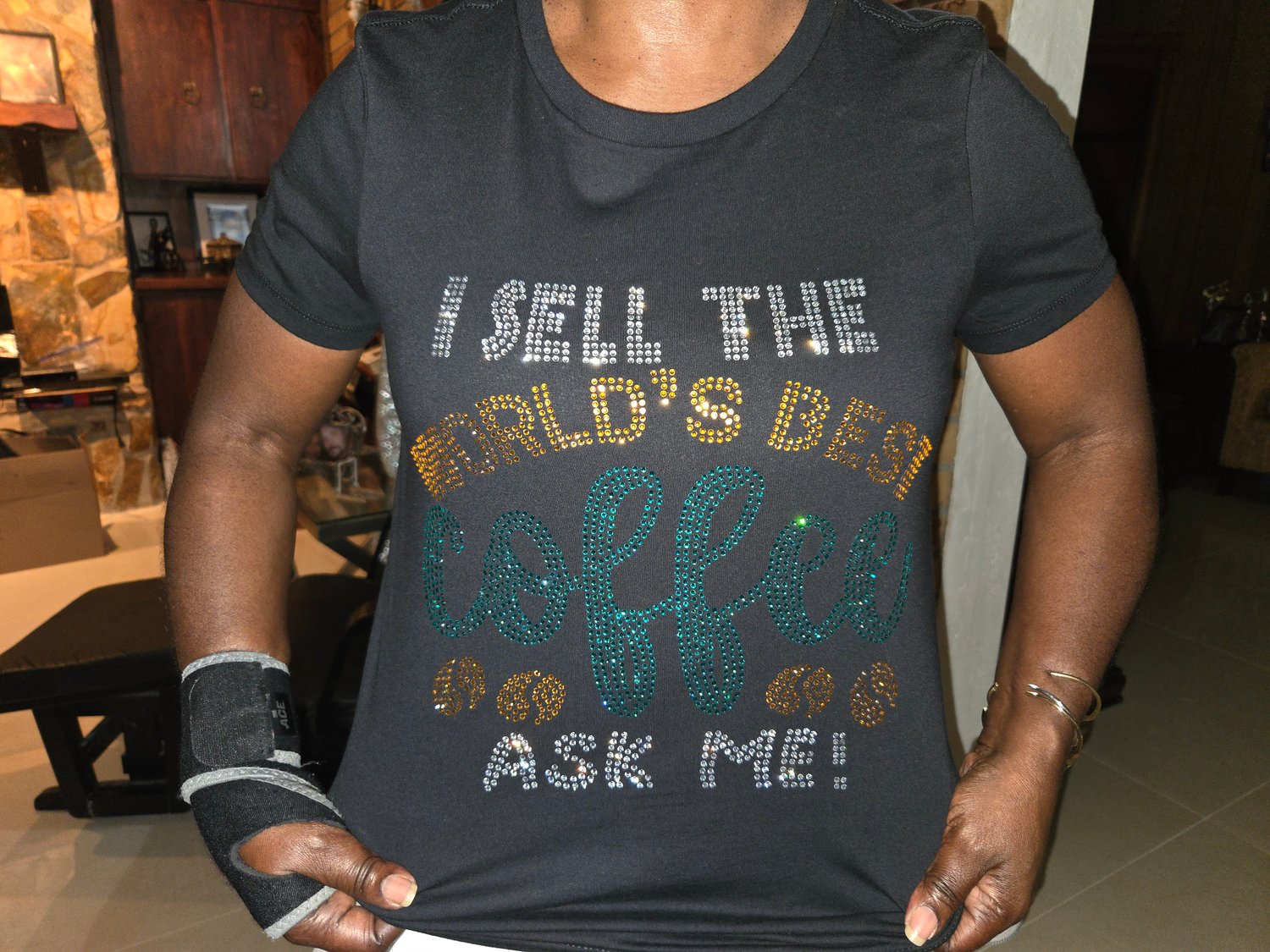 This dazzling rhinestone tee says it all: “I Sell the World’s Best Coffee — Ask Me!” and is the perfect conversation starter for Alive Coffee reps. Whether you're at events, pop-up shops, or just running errands, this tee turns curiosity into customers.