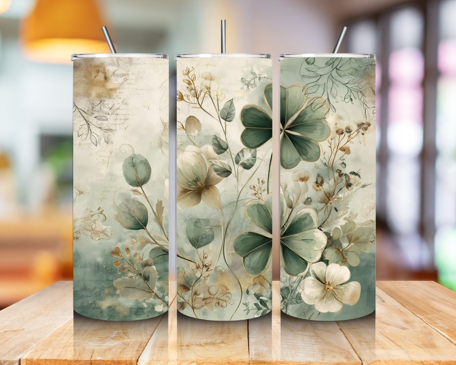 This elegant digital showcase a delicate blend of botanical florals and softly detailed four-leaf clovers set against a vintage-inspired, parchment-style background. Muted sage greens, warm ivory tones, and subtle gold accents create a timeless, romantic aesthetic. Fine linework and watercolor-style textures give the composition a handcrafted, heirloom feel, while layered foliage and gentle script elements add depth and sophistication.