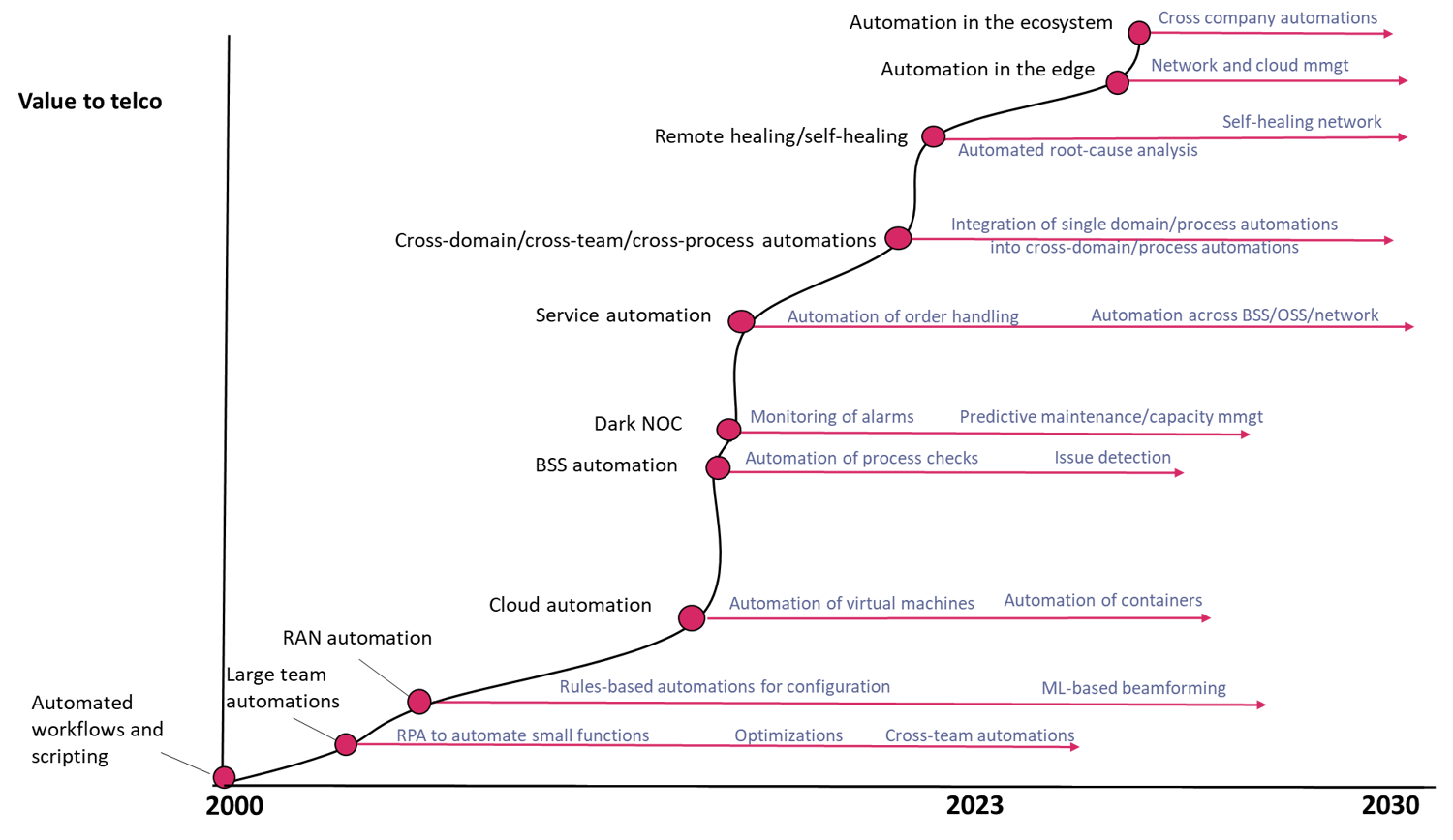 The maturity of telco automations in the network, OSS and BSS varies significantly, with some telcos reporting significant headcount reductions from mature automations, including analytics and machine learning; and others still in the early stages of simple automation deployments. This research looks at the value of automation to a telco, how intelligence will merge with these automations and some of the most immediate actions a telco should be taking to realize its intelligent automation vision.