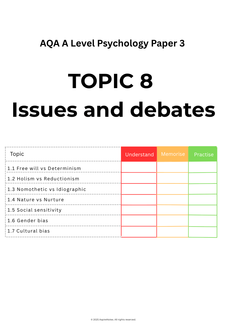 These Issues and Debates notes cover everything you need - and nothing you don’t - with clear, structured summaries that make revision simple and effective. Designed around the AQA specification, each page focuses on understanding, evaluation, and exam application, so you can revise with confidence.