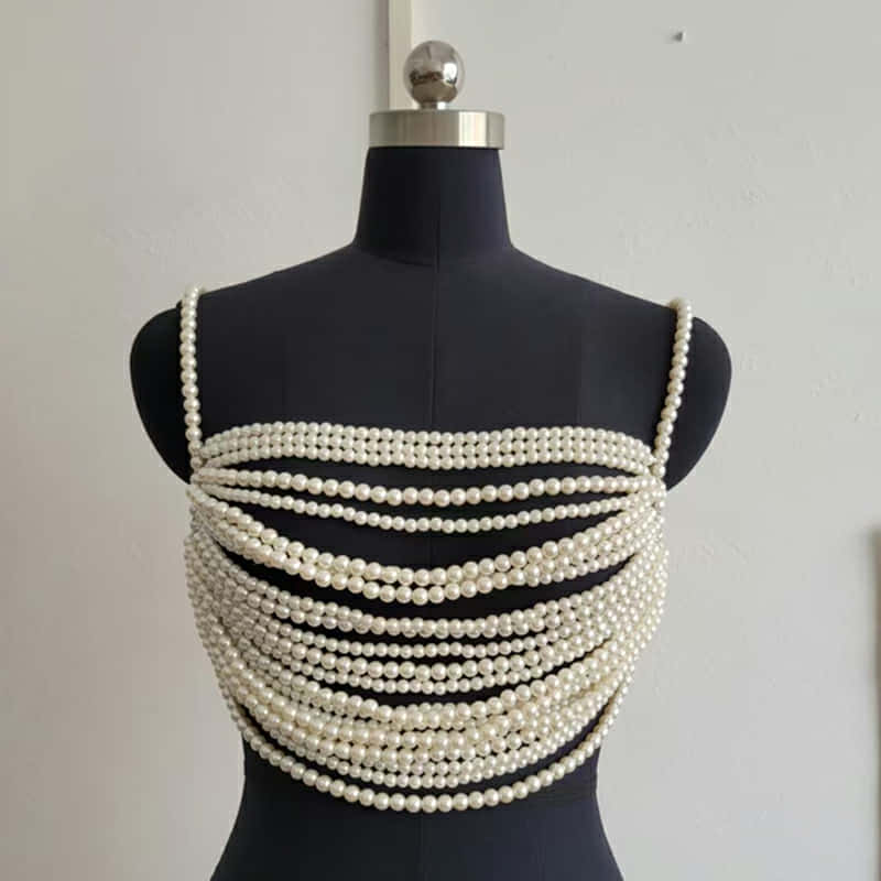 Layers of pearls drape softly across the bust, catching the light and highlighting your skin with an elegant, feminine glow.