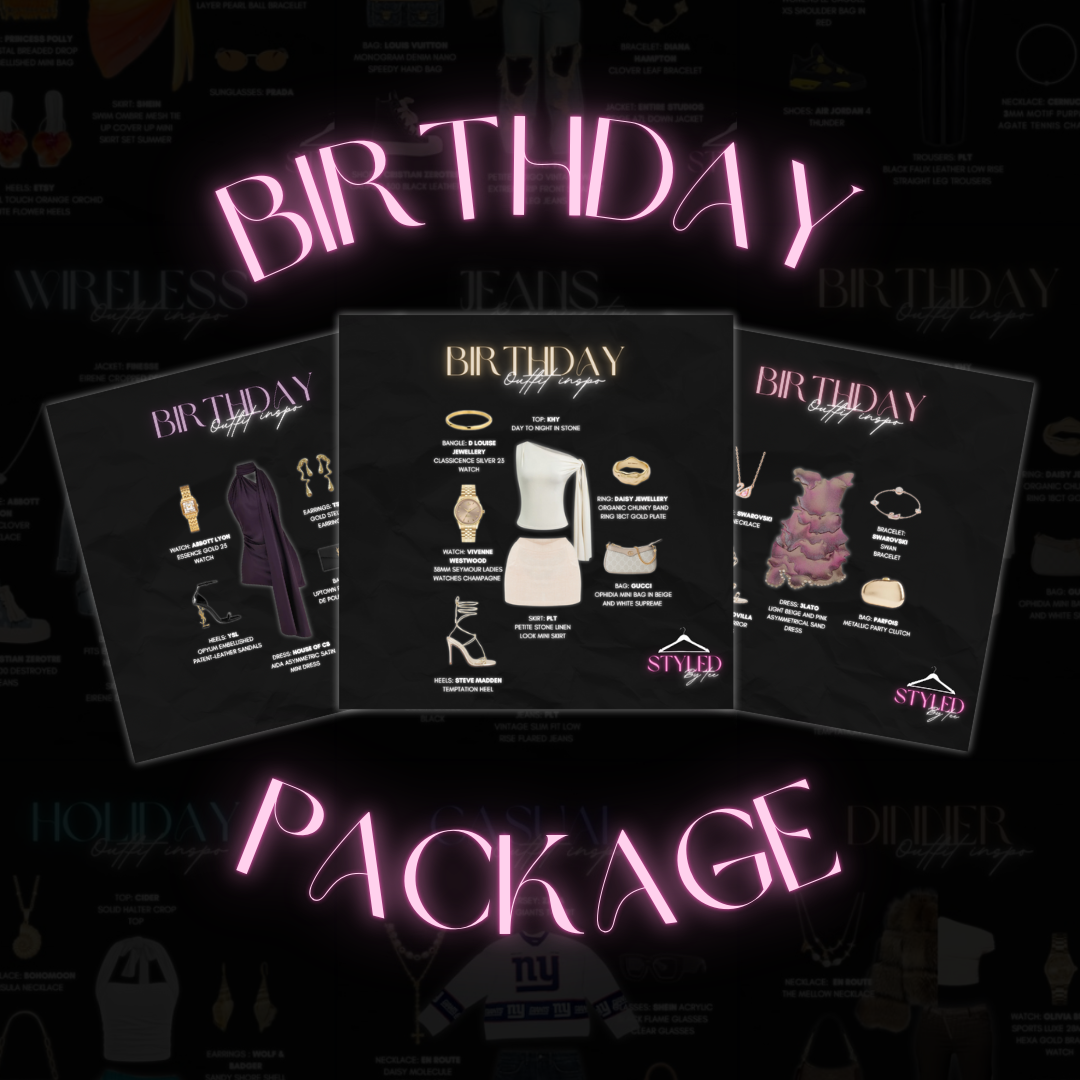 Celebrate your special day in style with our Birthday Styling Service. This package includes three to four personalised looks, each curated to reflect your unique style and personality. You'll receive direct product links, styling tips, and a full price breakdown, along with alternative options for every item.
