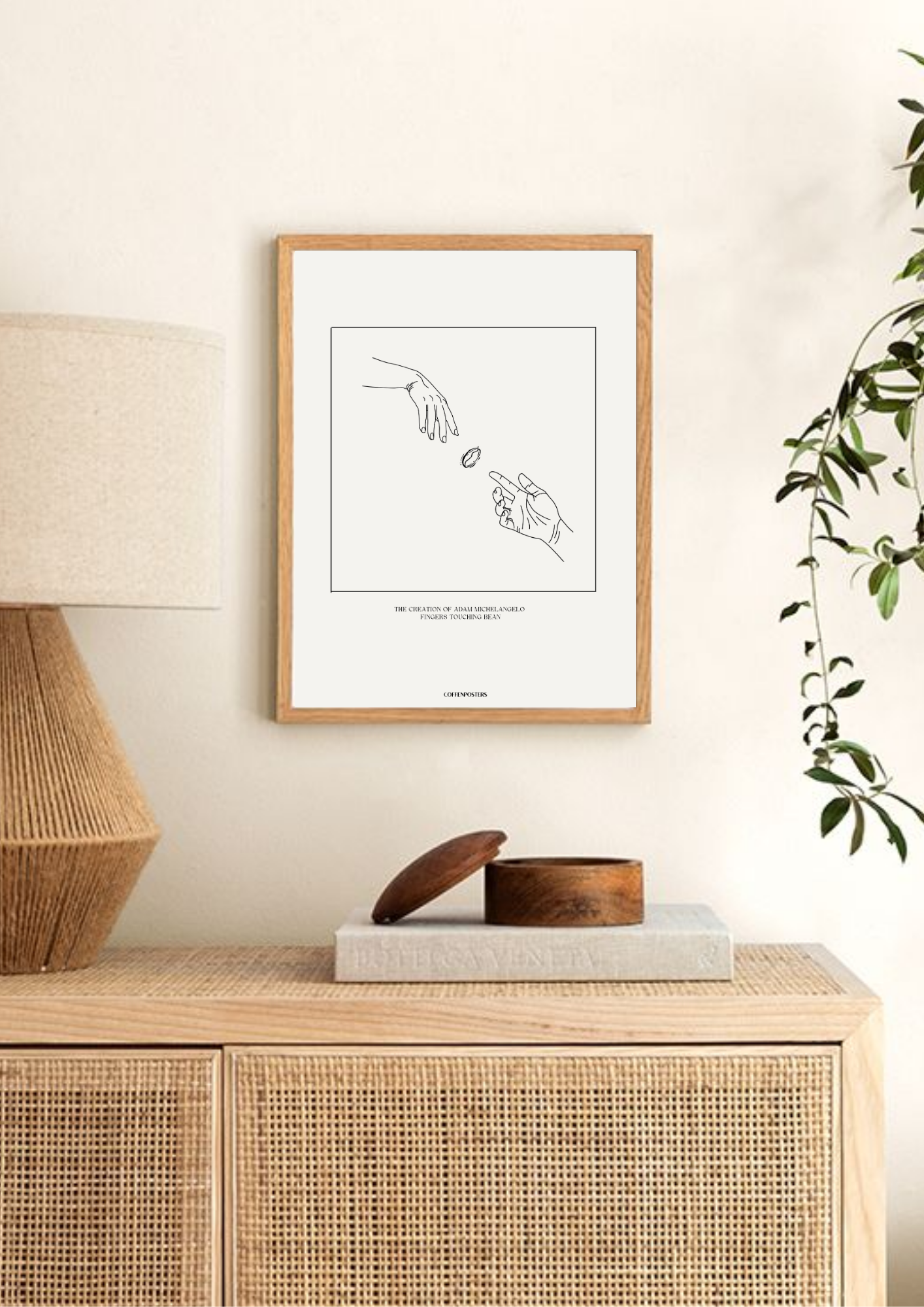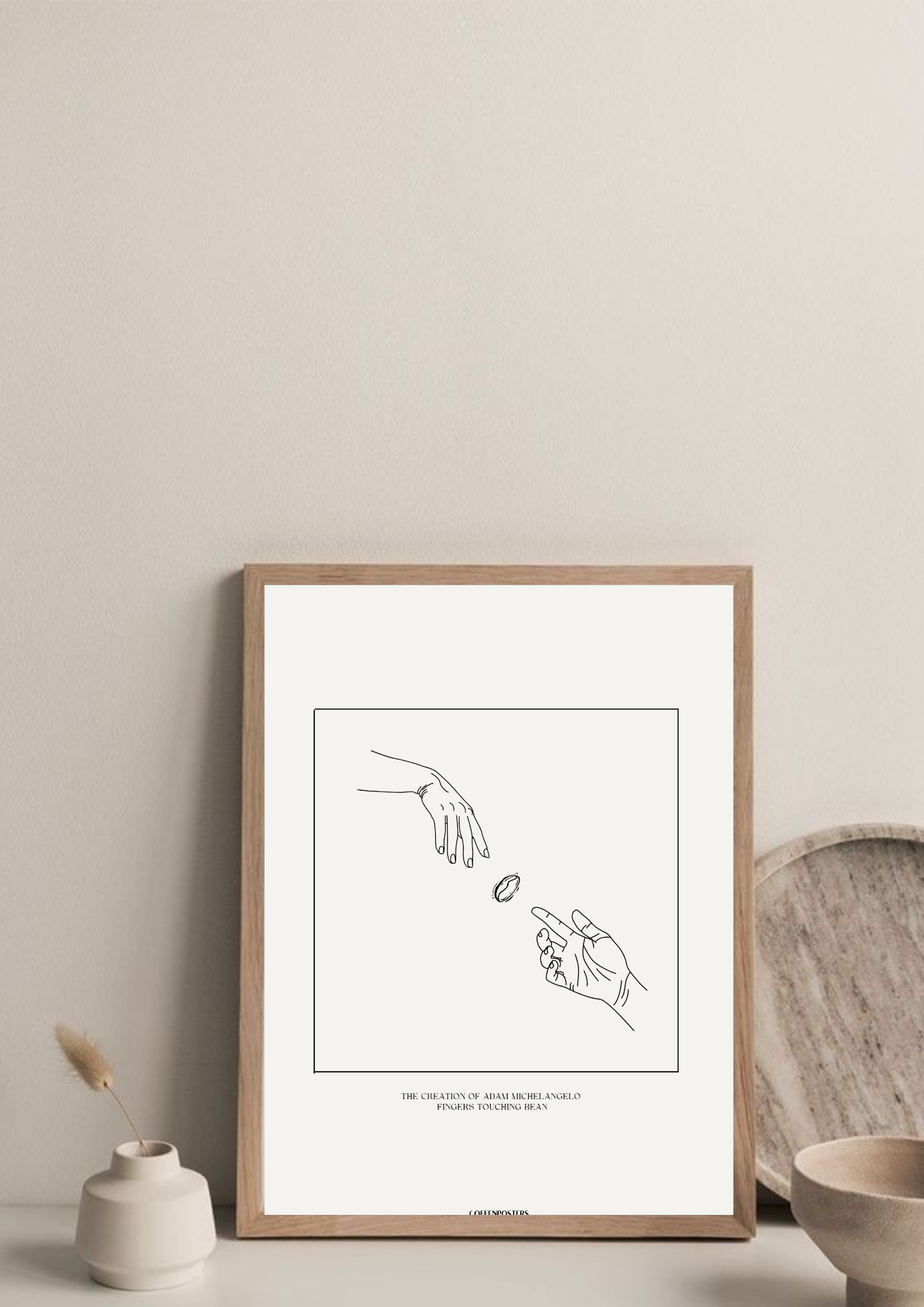 Discover "Fingers Touching Beans," a unique coffee art print inspired by Michelangelo's Creation of Adam. This stunning piece adds a coffee twist to the iconic painting, making it perfect for coffee lovers and art enthusiasts. Bring a touch of Renaissance elegance and coffee vibes to your home decor.