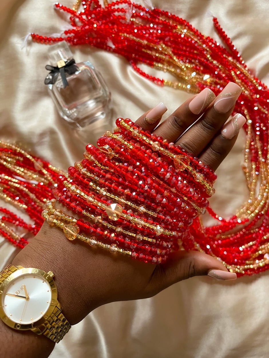 This gorgeous African waist bead in radiant ruby red is designed for Queens who crave luxury.