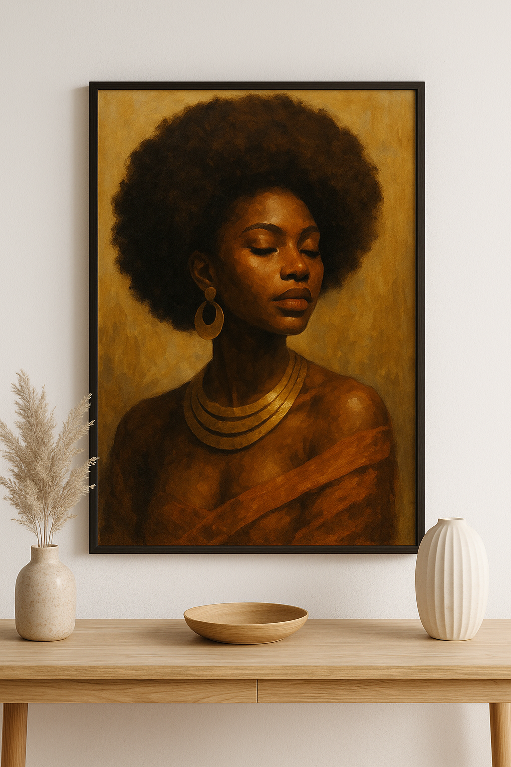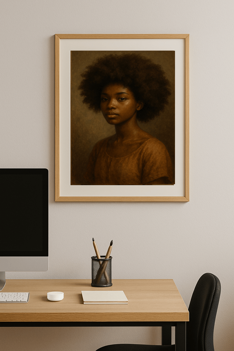 Celebrate beauty, strength, and heritage with Crowned in Melanin, a stunning portrait of a Black woman with a natural afro, depicted in rich, earthy tones that evoke warmth and elegance. This realistic digital painting adds soulful character to any space — perfect for modern homes, offices, salons, or culturally inspired décor themes.