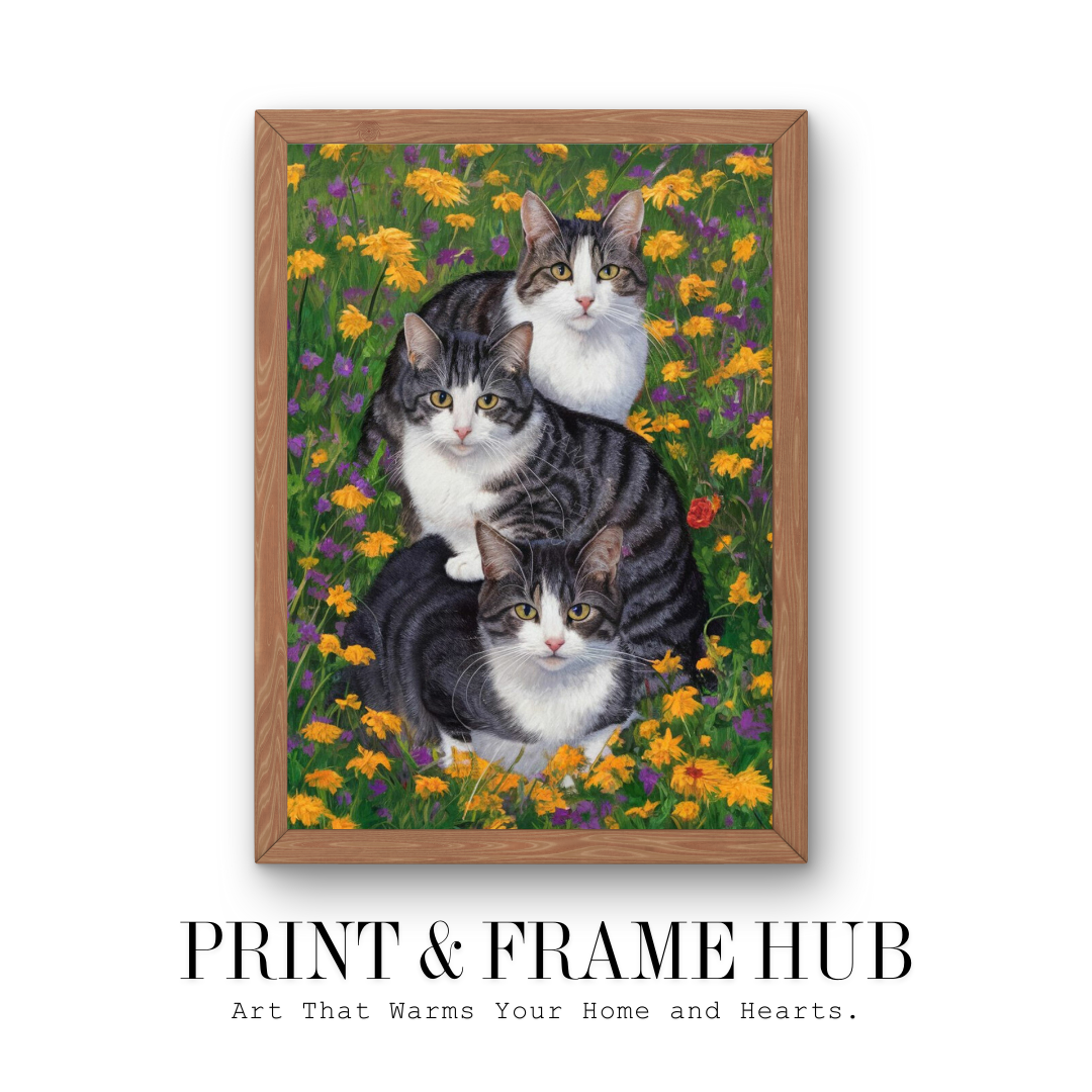 Add charm to your space with "Three Cats," featuring three adorable cats amidst vibrant flowers. The vivid colors and playful scene bring joy and warmth to any wall, perfect for cat lovers and nature enthusiasts.