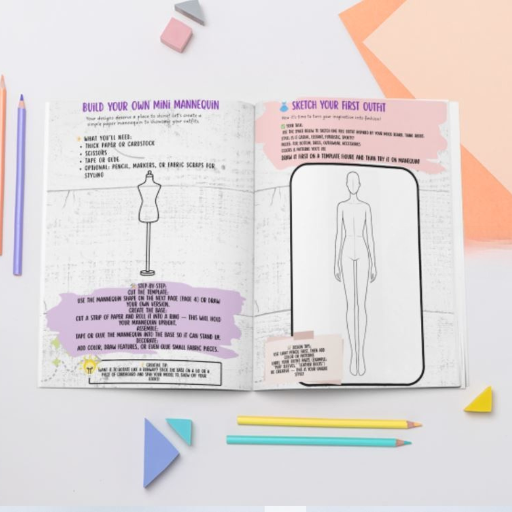 This interactive digital workbook is a fun and creative introduction to the world of fashion. Designed for kids aged 8–15, it includes hands-on activities like building a DIY paper mannequin, exploring design concepts, and practicing sketching through simple, guided exercises.