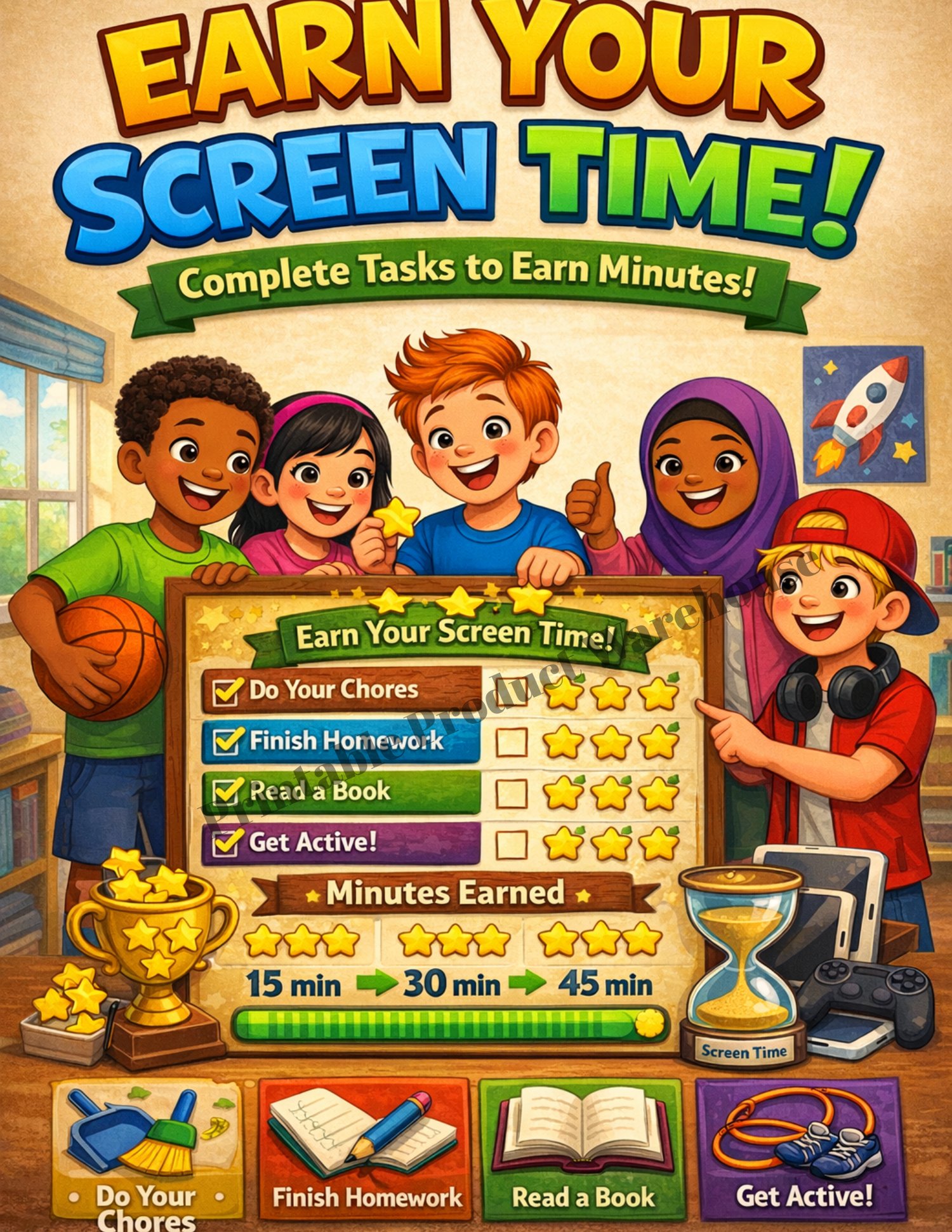 This fun printable chart allows children to earn screen time by completing chores, homework, and positive tasks.