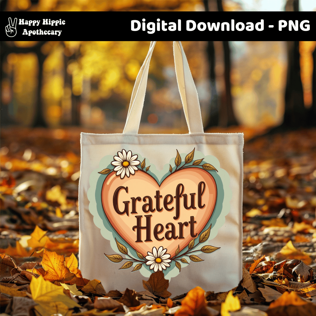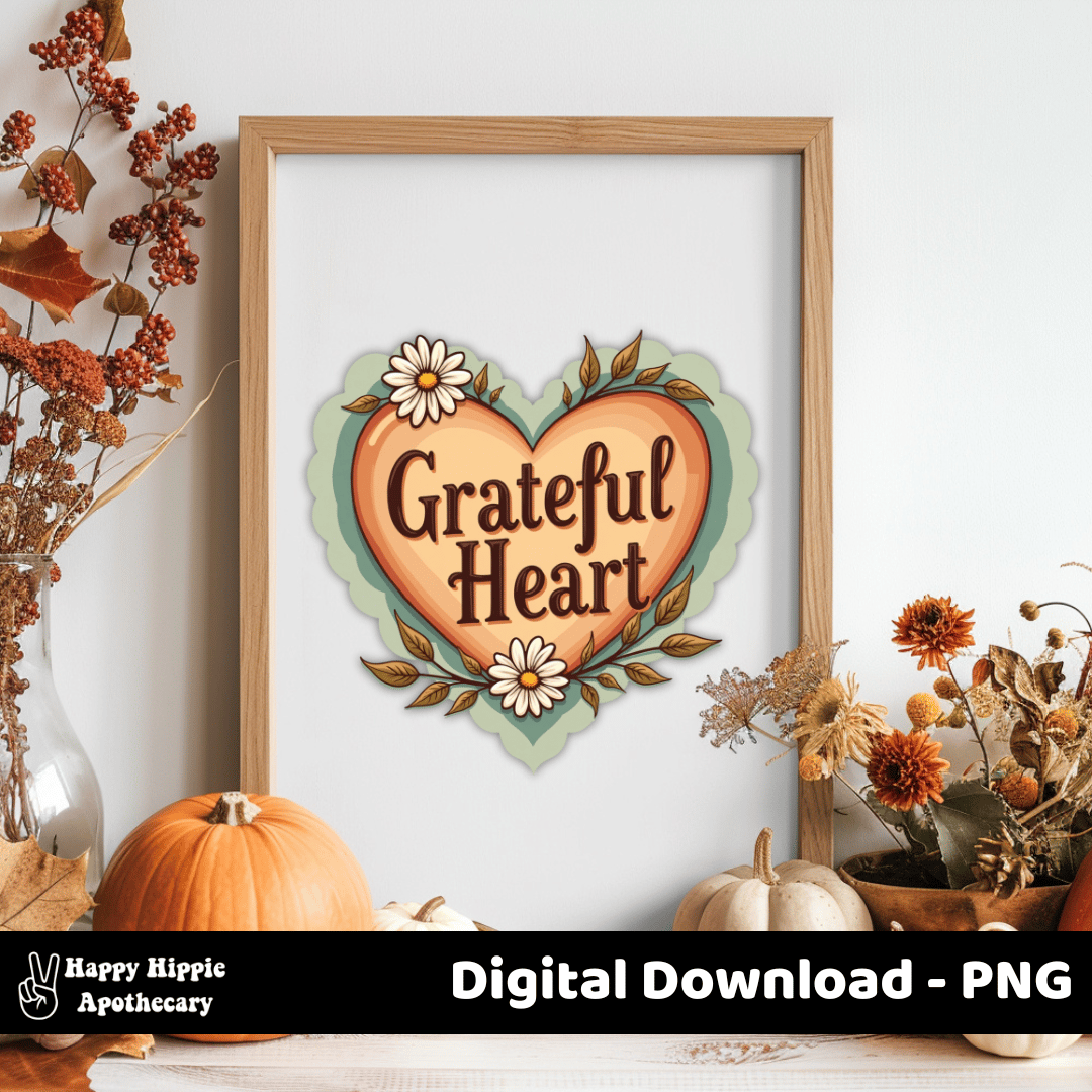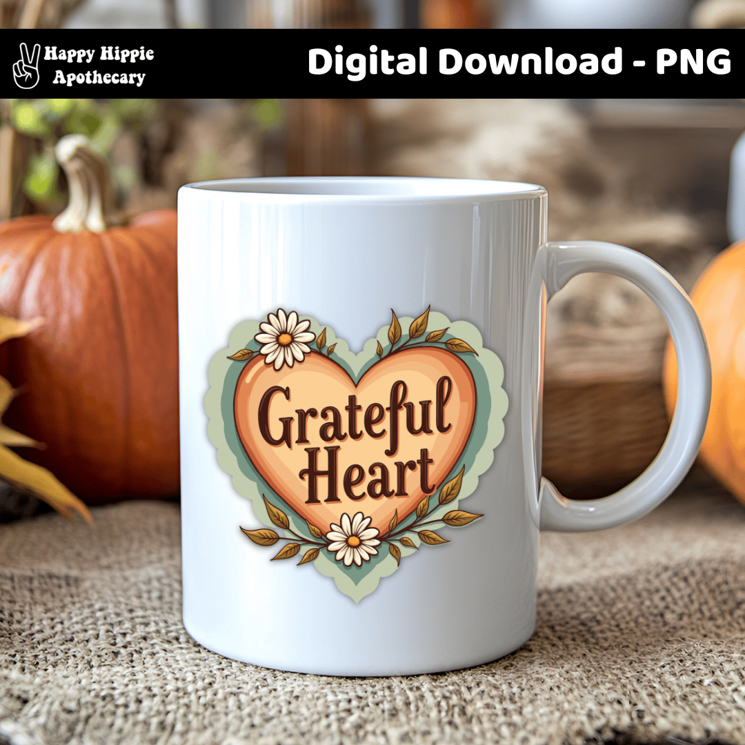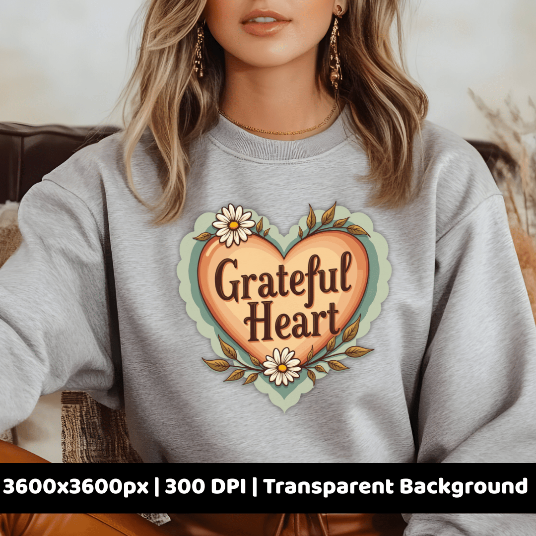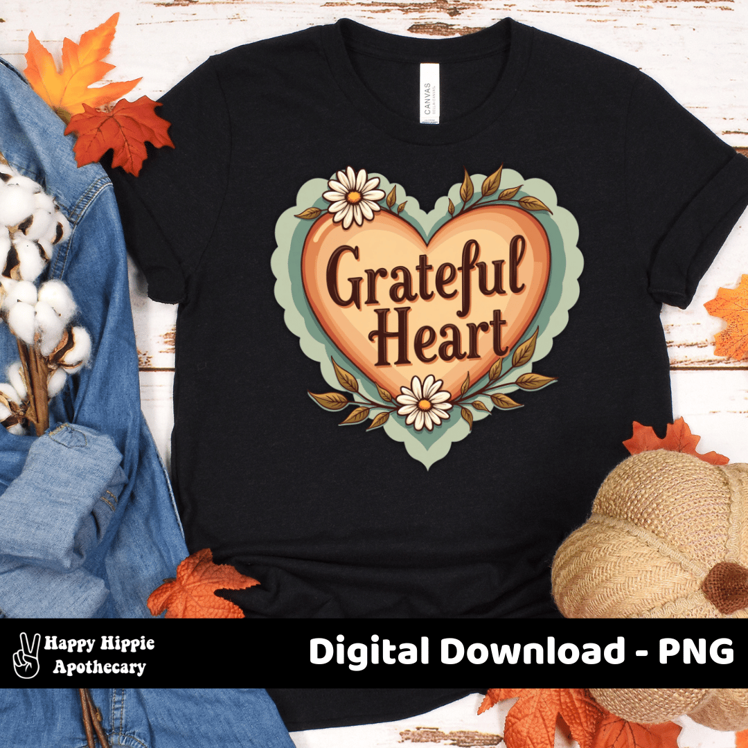 Share cozy gratitude vibes with this Grateful Heart PNG. Featuring a retro-style heart with flowers and leaves, this design is perfect for sublimation, stickers, mugs, shirts, tote bags, and more!