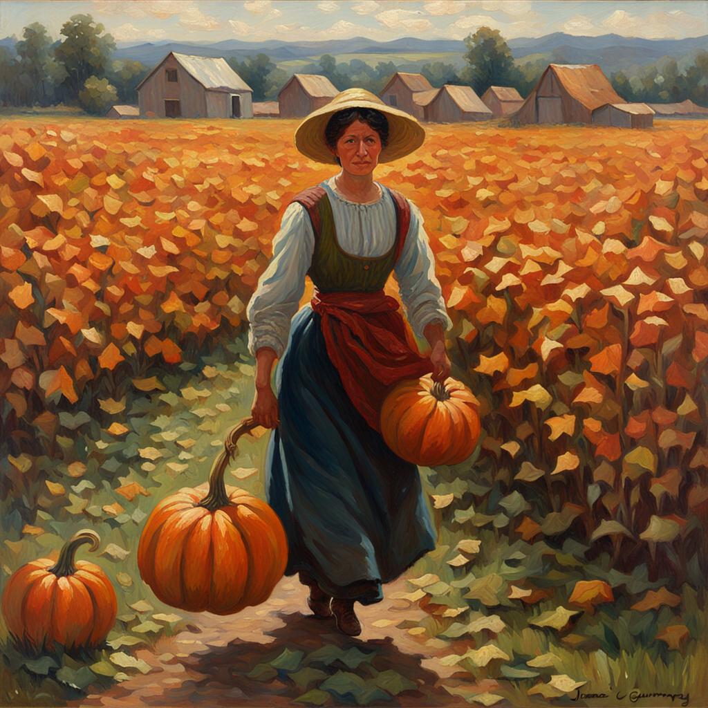 A peasant woman carrying a pumpkin walks in a field amidst pumpkin leaves