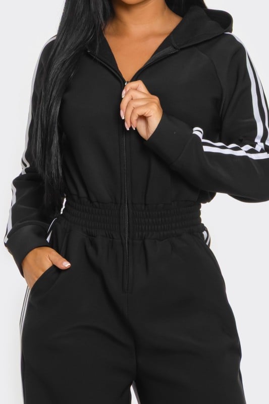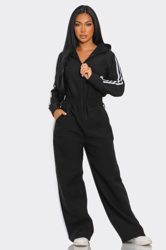 Step into effortless style with the On The Track Hooded Jumpsuit, your go-to for cozy streetwear with a luxe edge. Designed with a sleek hood and front zipper, this jumpsuit blends sporty vibes with polished detailing. The elastic waist cinches for a flattering fit, while lined fleece keeps you warm and comfortable.