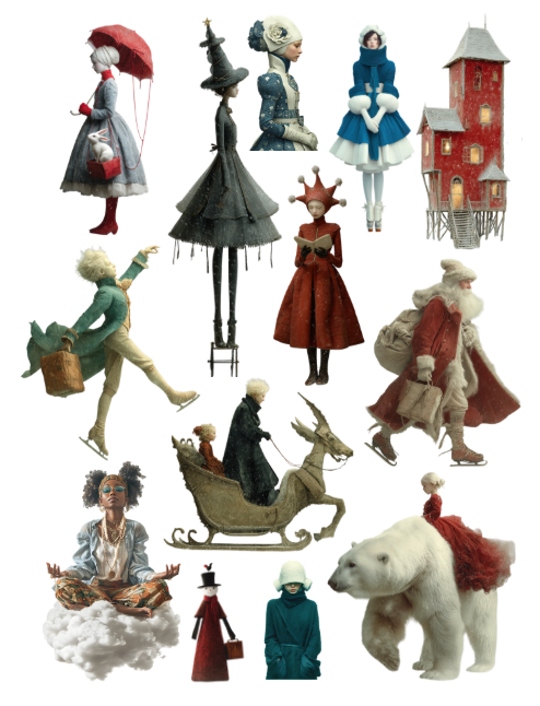 This Snowy Ephemera to Cut and Collage Book features: