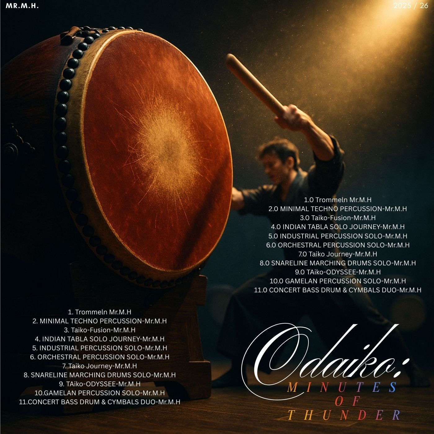 Eine einzelne Odaiko-Riesentrommel (2m Durchmesser) trifft auf Shime- und Nagado-Daiko in einem von 5 Akten konstruierten Solowerk. Von ppp (Flüstern) bis fff (Erdbeben) ohne digitale Effekte.